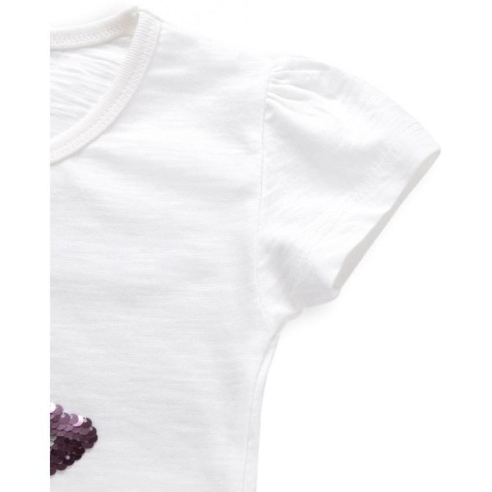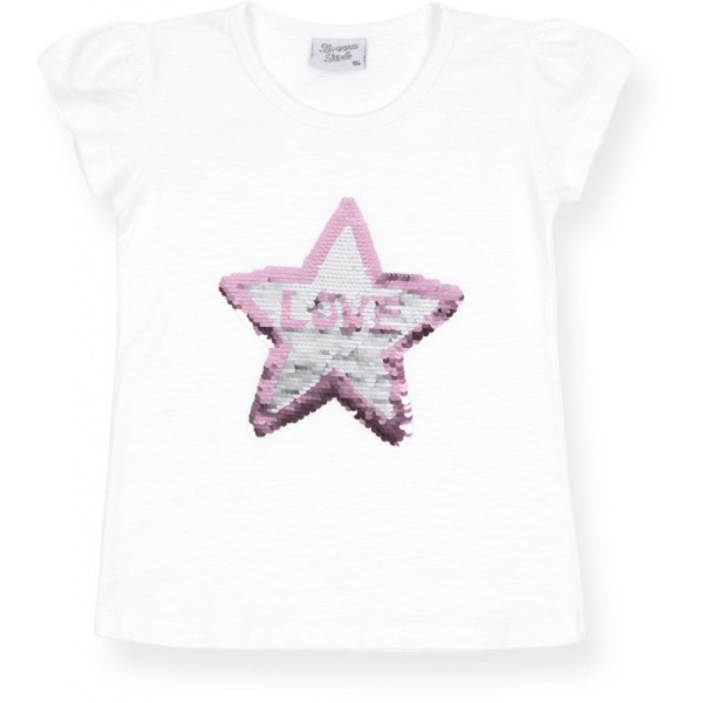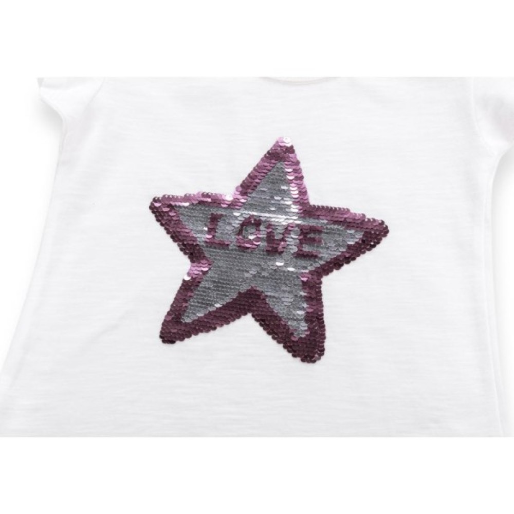 Модна, стильна, приємна на дотик модель з коротким рукавом, призбореним по окату, і еластичною круглою горловиною, оформленою трикотажною резинкою. Спереду прикрашена класною деталлю - аплікацією у вигляді зірки з написом «LOVE» в середині, виконаною з сріблястих і рожевих пайєток. Родзинка цієї аплікації в тому, що якщо рукою поміняти напрям пайєток, то змінюється і колір аплікації.