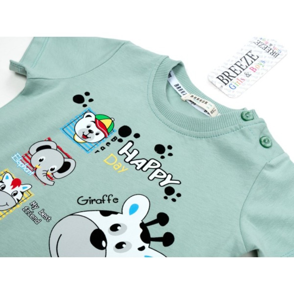 - Легка трикотажна футболочка приємного пастельно-м'ятного кольору з малюнками симпатичних веселих тваринок - відмінний літній варіант для вашої дитини.