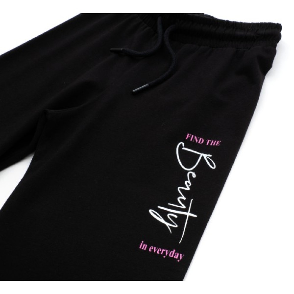 • Зручні, стильні укорочені трикотажні штани-кюлоти, на широкому поясі, прикрашені кольоровим принтованим написом.