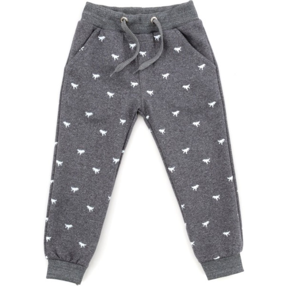 Зручні, вільні спортивні штани темно - сірого меланжевого кольору (кольору «антрацит») з дуже приємного двониткового турецького трикотажу (100% бавовна). Штанці по всій поверхні прикрашені фігурками маленьких динозавриків білого кольору.