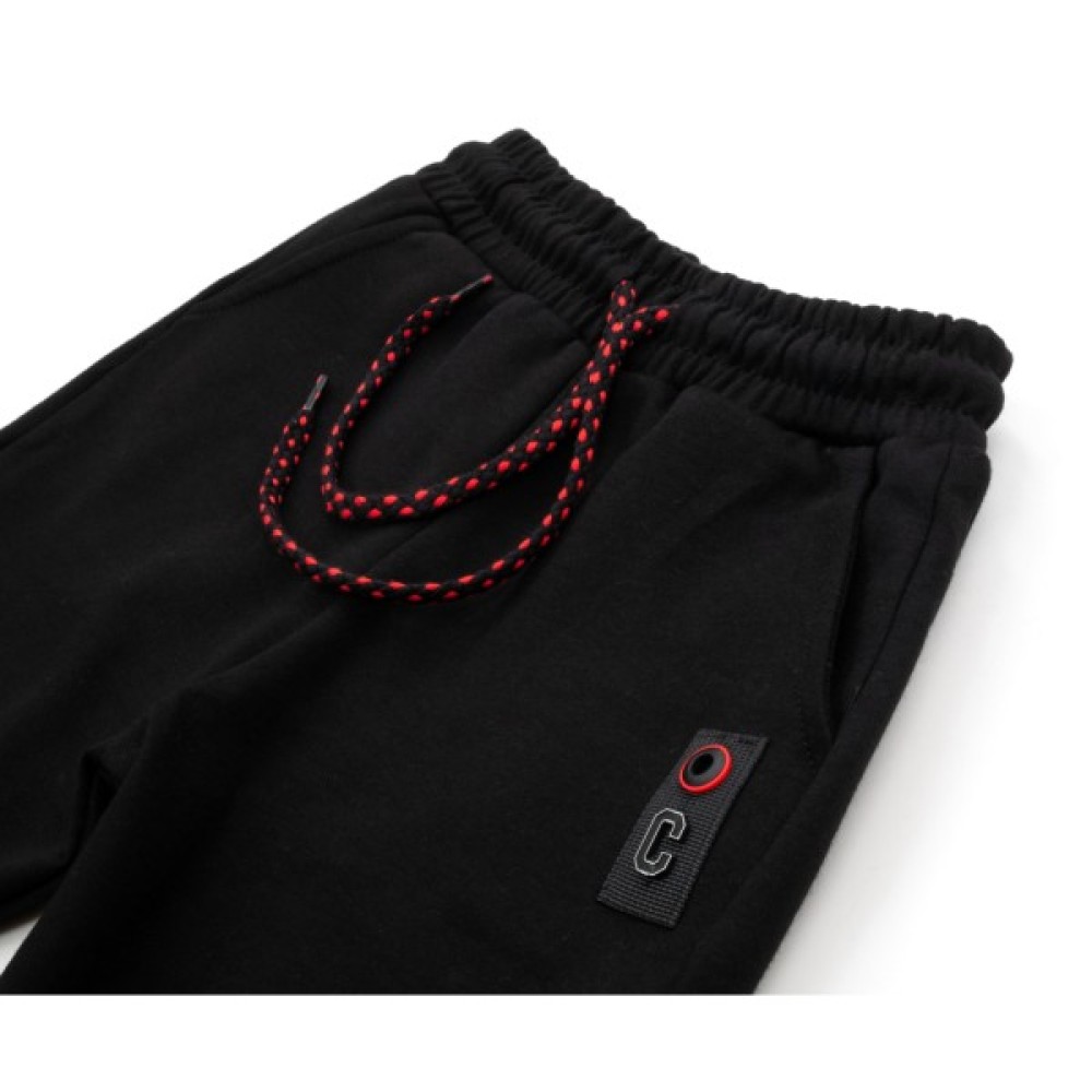 Зручні, чорного кольору, спортивні штани на манжетах. Штани пошиті з дуже приємного на дотик, якісного, м'якого, гладкого турецького трикотажу середньої щільності. Зліва штани оздоблені нашивкою. Також додатковою прикрасою служить шнурок чорно - червоного кольору.