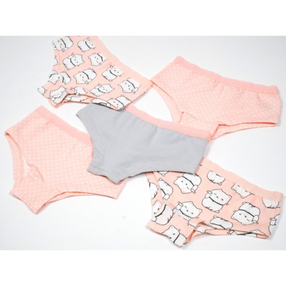 - У комплект входять 5 трикотажних бавовняних трусиків-сліпів, mix кольорів у приємних пастельних тонах, з симпатичними малюночками.