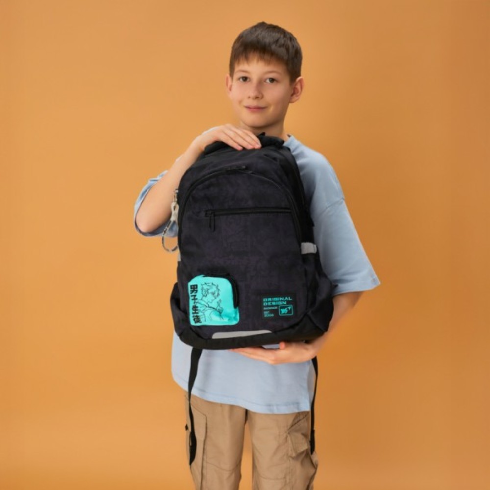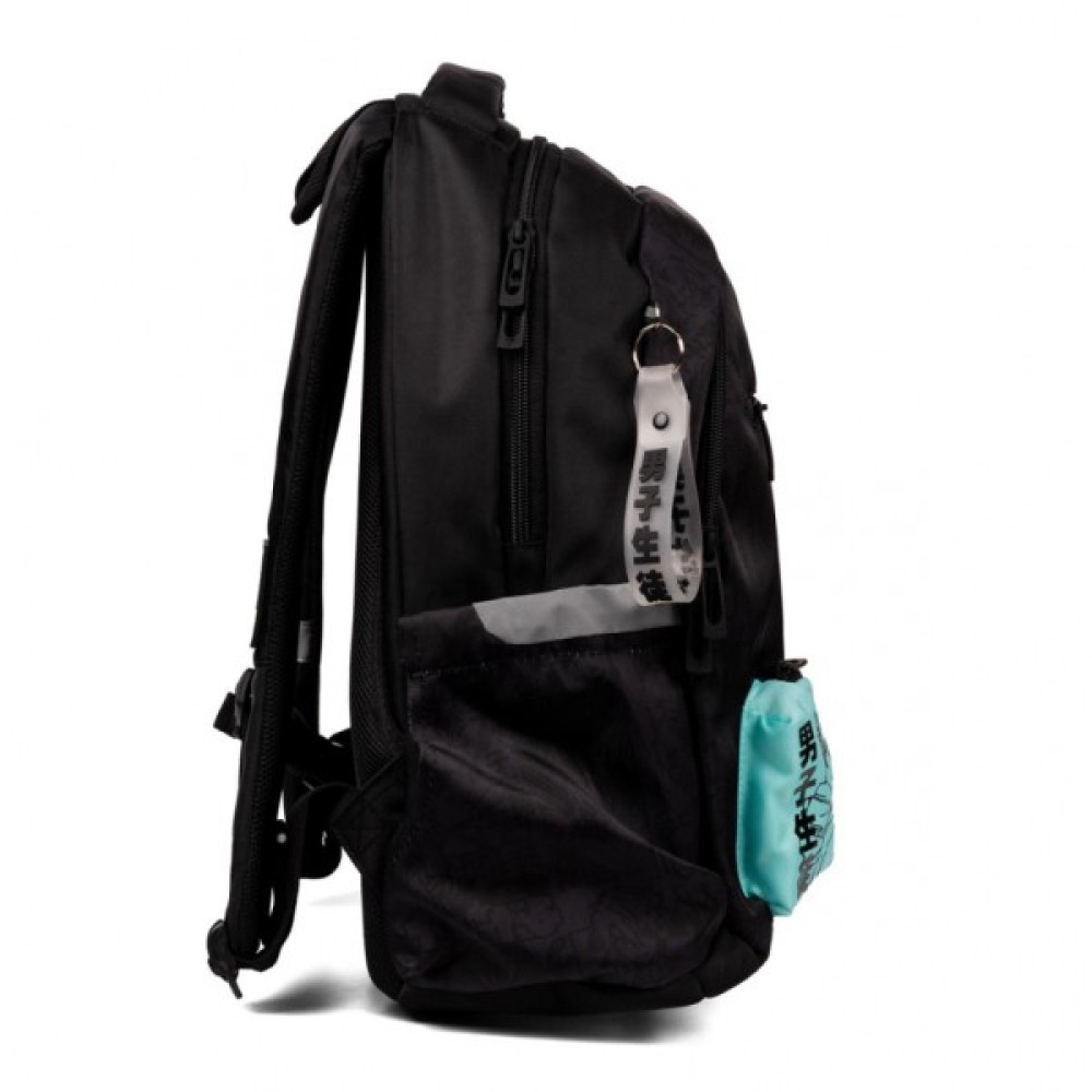 Стильний чорний рюкзак з аніме персонажем на додатковій кишеньці та тематичним брелоком неодмінно вподобають підлітки.