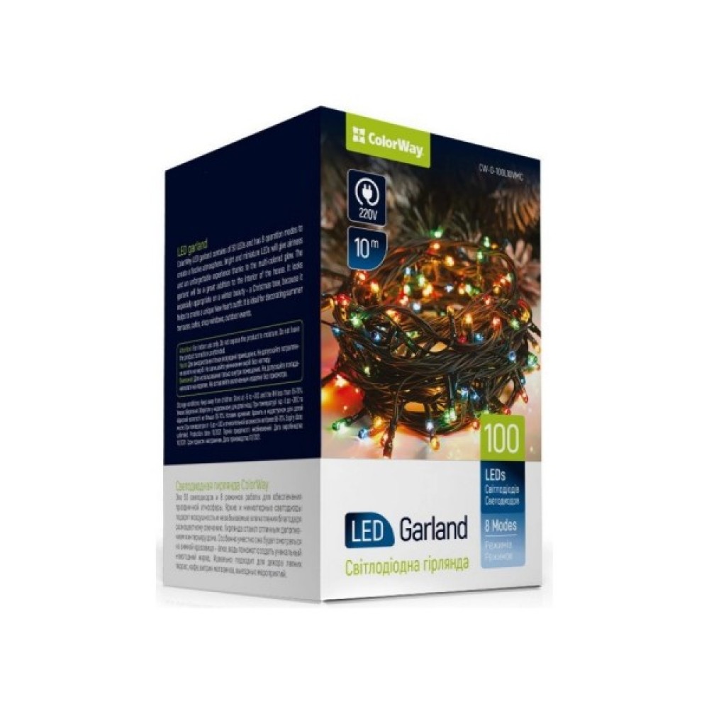 Гірлянда ColorWay LED 100 Color 10м 8 функцій 220V (CW-G-100L10VMC) є вашою універсальною прикрасою, яка допоможе створити справжню атмосферу свята і радості. Завдяки світлодіодним лампочкам, які відрізняються своєю економічністю та довговічністю, гірлянда прослужить вам довгі роки, зберігаючи свою початкову яскравість і насиченість кольорів. Різнокольорове» світіння мініатюрних діодів у вигляді капсул забезпечує унікальний візуальний ефект, який стане родзинкою вашого декору як вдома, так і поза його межами.