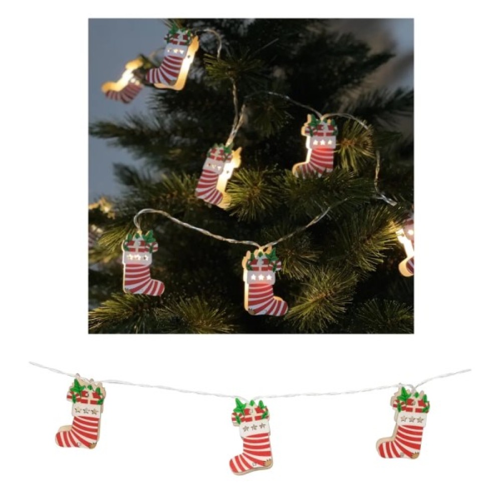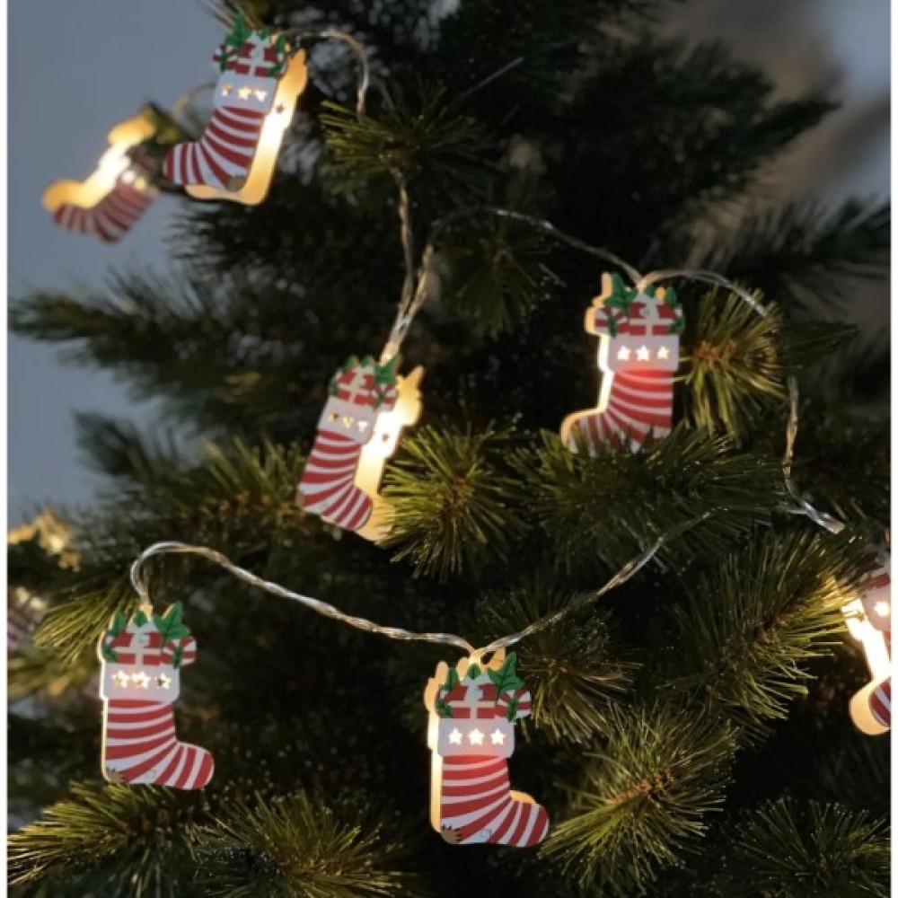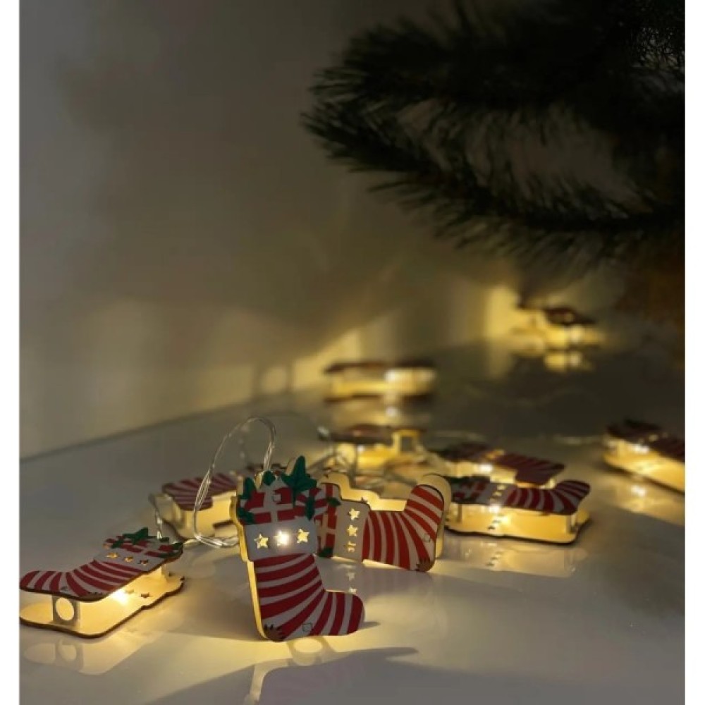 Особливу увагу привертає форма прикрас у вигляді об'ємних шкарпеток, виконаних з високоякісного пластику та дерева. Ці матеріали об'єднують в собі естетику та практичність, забезпечуючи елемент декору, що не лише прикрашає, але і витримує перевірку часом. Відзначте особливу вишуканість і ретельність виконання деталей — це те, що дійсно відрізняє цю гірлянду від інших.