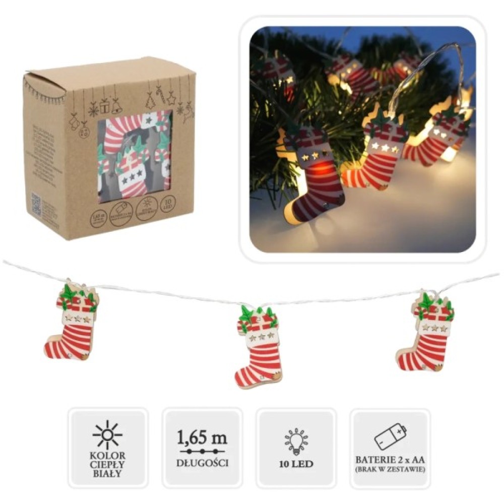 Гірлянда Chomik "Шкарпетка новорічна" 1.65 м 10 LED Теплий білий (5900779854093) — це ідеальне рішення для тих, хто прагне створити неповторну атмосферу свята у своєму домі. Польський бренд Chomik пропонує вам відмінну якість і довговічність, втілені в цій світлодіодній LED гірлянді. Зроблена у вигляді нитки, вона становить 1.65 метра у довжину і налічує десять LED-лампочок, які випромінюють теплий білий колір. Це ніжне світіння і створює затишок та комфорт у вашому домі, які відчуваються з перших же хвилин.