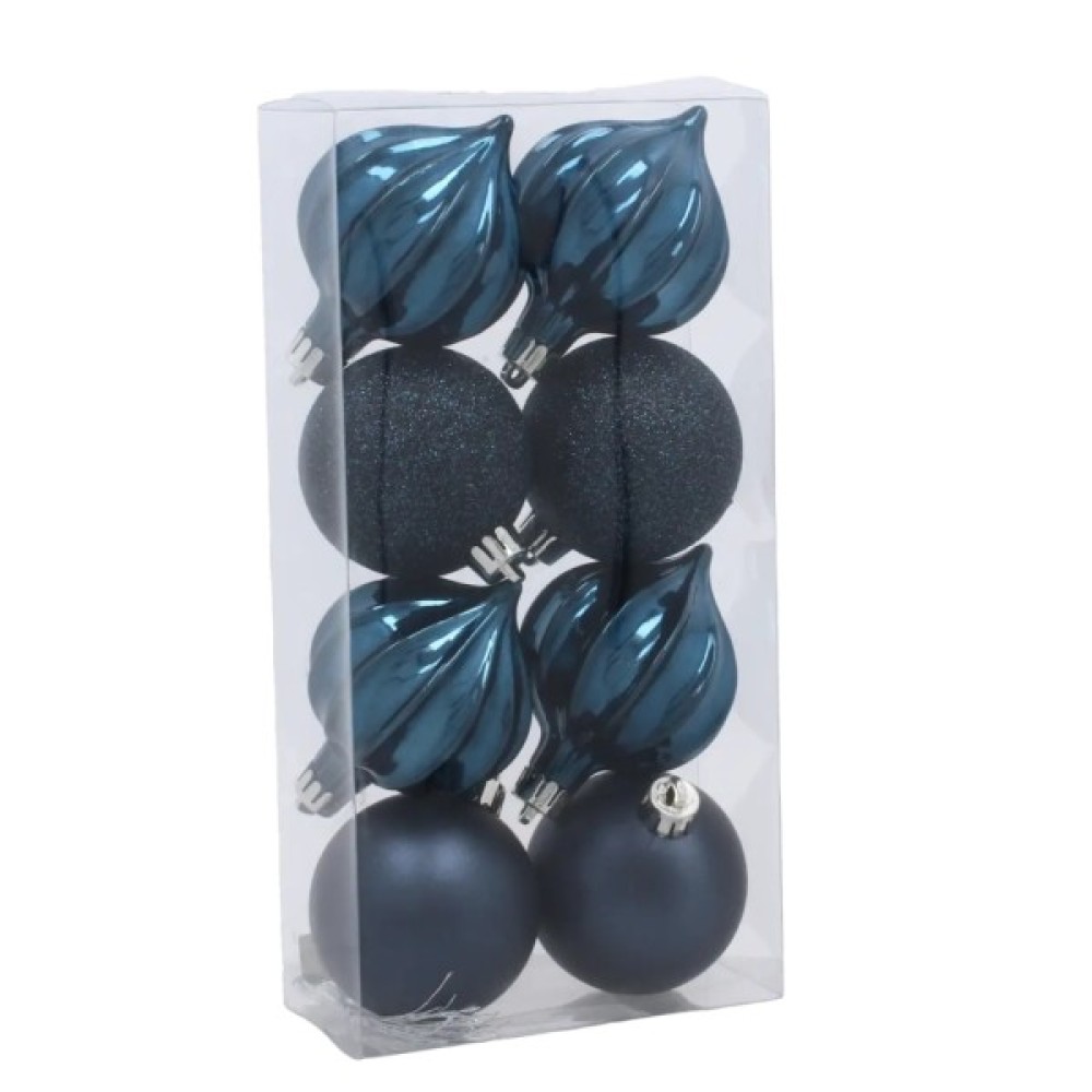 Набір Chomik у синьому кольорі — це гармонійне поєднання глибокого відтінку та різних фактур, що надають декору вишуканого й урочистого вигляду. У комплекті 8 пластикових кульок діаметром 6 см: серед них є класичні матові, прикраси з глітерним блиском, а також рельєфні моделі у формі краплі. Завдяки цьому набір виглядає цілісно й водночас динамічно, адже кожен тип поверхні по-різному взаємодіє зі світлом. Синій колір — популярний вибір для зимового оформлення, який вдало поєднується з білими, сріблястими або золотистими елементами.