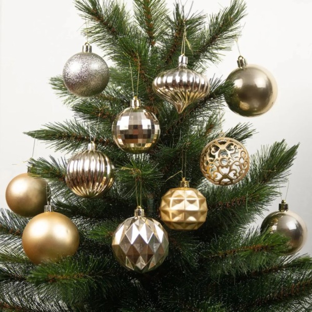 Особливістю набору є широке різноманіття покриттів (матові - 14 шт; рельєфні матові - 12; глянцеві - 12; рельєфні глянцеві - 22), форм та розмірів (Ø 7/6 см) пластикових прикрас, представлених у стильному відтінку* шампань, що особливо вдало виглядають на фоні хвої, а також впишуться у будь-який інтер'єр. Крім традиційних кульок середніх розмірів, до комплекту входять мереживні кульки та підвісні прикраси у формі дзиги — що дозволяють вишукано оздобити новорічне дерево у повноцінну святкову композицію. Залишається лише вдягнути іграшки на вашу ялиночку!