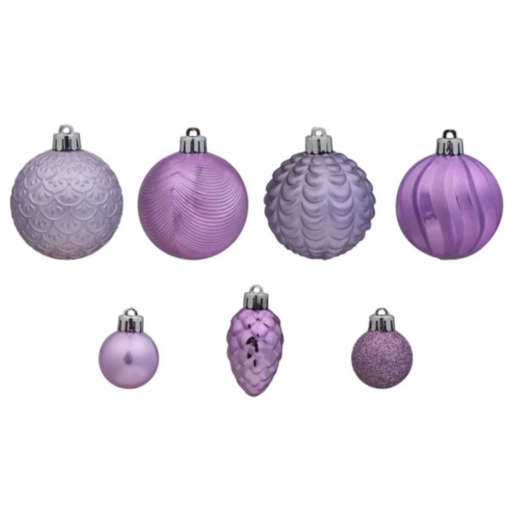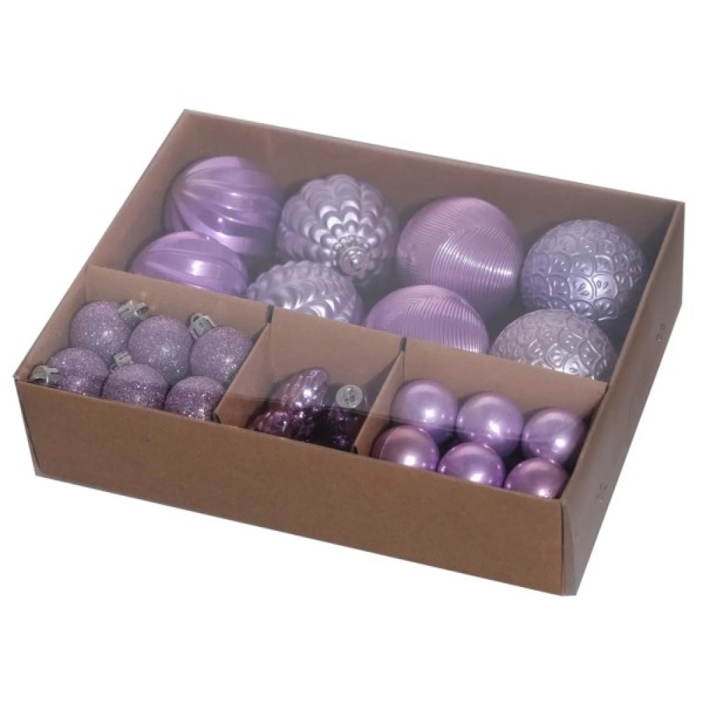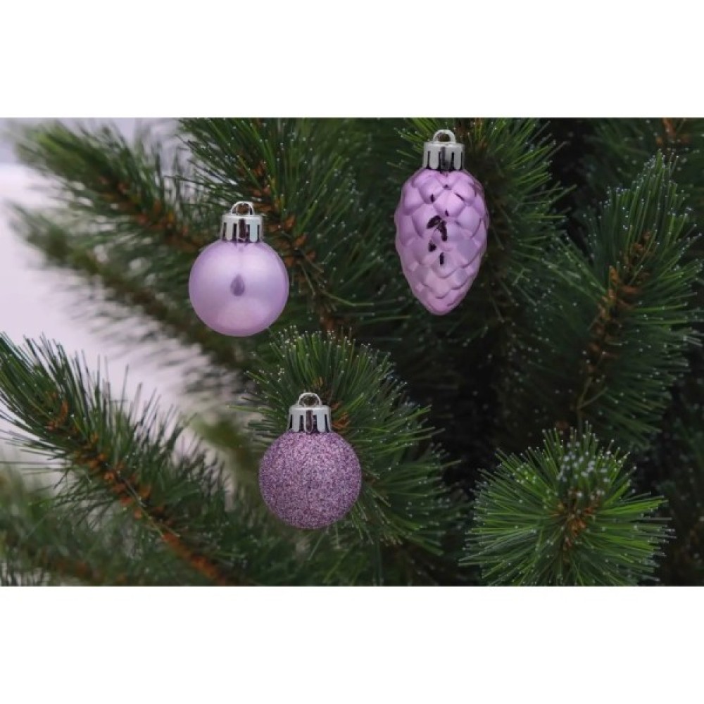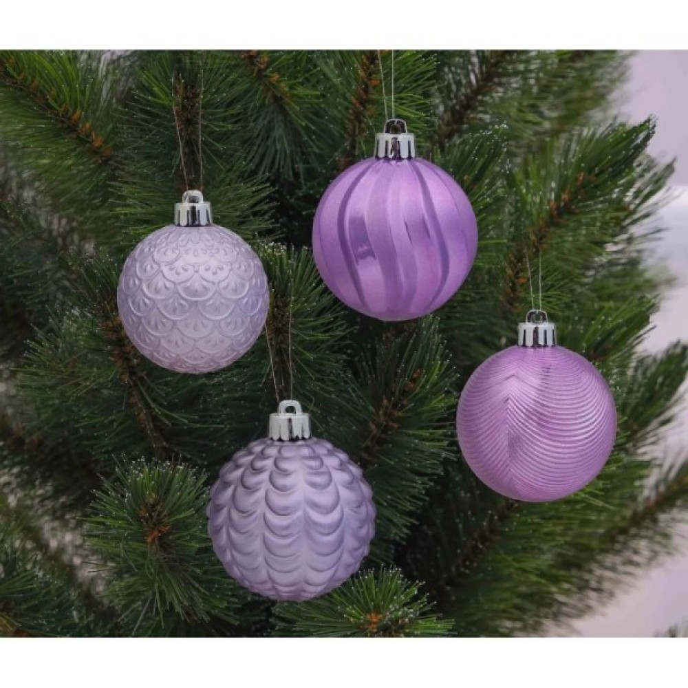 Особливістю набору є різноманіття розмірів та покриттів кульок, представлених у приємних бузкових відтінках, що дозволяє стильно оздобити новорічне дерево у повноцінну композицію.