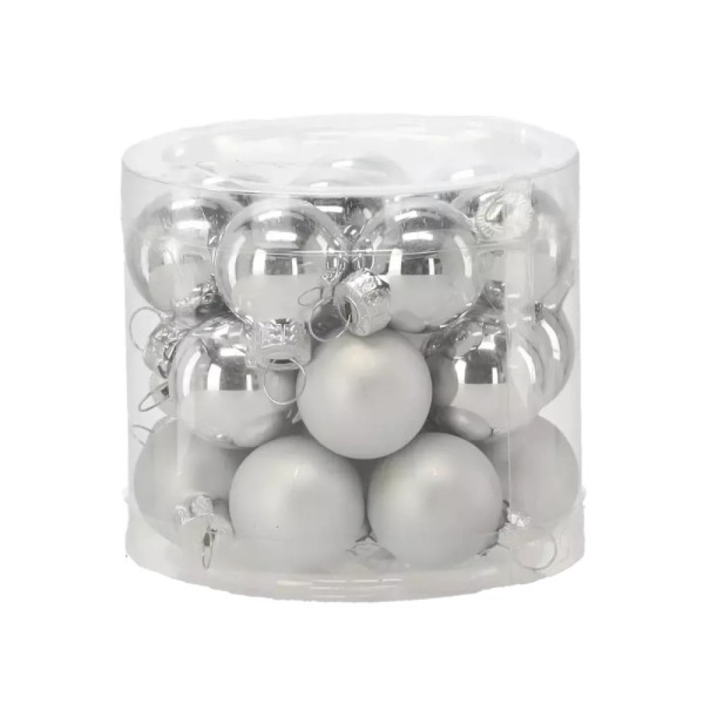 Набір Chomik — це стильна колекція з 24 мініатюрних прикрас діаметром 2,5 см, виконаних зі скла у благородному сріблястому відтінку. До складу входять 12 матових і 12 глянцевих кульок, що дозволяє створювати візуальну динаміку та контраст на ялинці. Завдяки компактному розміру вони чудово підходять як для основного декору невеликих дерев, так і як додаткові елементи на великих ялинках або святкових композиціях. Скляна поверхня красиво переливається у світлі гірлянд, додаючи легкості та вишуканості загальному оформленню.