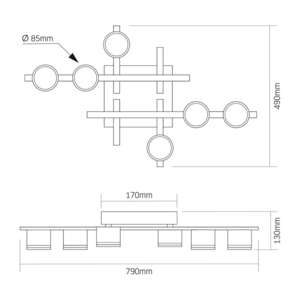 Загальні габаритні розміри світильника дозволяють легко інтегрувати його в різні інтер’єри: основа має розмір 170х170x45 мм, тоді як планки мають довжину 278 мм і 523 мм, а кожен з шести елементів - діаметром 85 мм і висотою 65 мм. Загалом, довжина світильника становить 790 мм, ширина 490 мм і висота 130 мм.