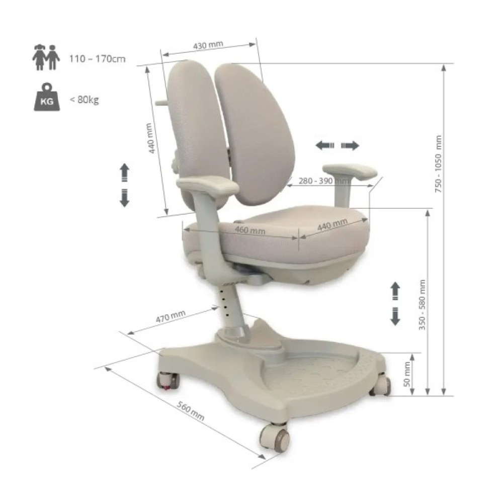 Для дітей від 3 років до підліткового віку. Підходить для зросту від 110 до 170 см. Можна використовувати як зі партою, що росте, так і зі звичайною. Змінюючи глибину спинки та висоту сидіння, Ви підберете найкомфортніше положення для дитини. Колеса мають функцію стоп- обертання під час саджання в крісло дитини понад 25 кг. У кріслі FunDesk Vetro блокування відбувається завдяки кнопці, яка під час увімкнення (функція ON) блокує колеса та припиняє рух на будь-якій поверхні під тиском 20 кг. Під час вимкнення кнопки (функція OFF) на коліщатках крісла, його вільно можна пересувати кімнатою. Малюк не відвертатиме уваги від занять, катаючись на кріслі. Крісло має підставку для ніг.