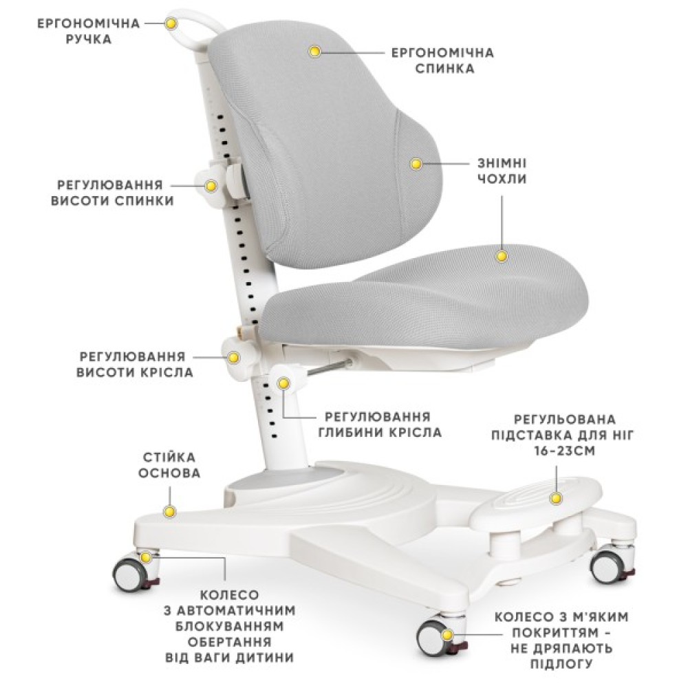 - Регульована висота як спинки, так і сидіння дозволяє налаштувати крісло під зріст дитини.
