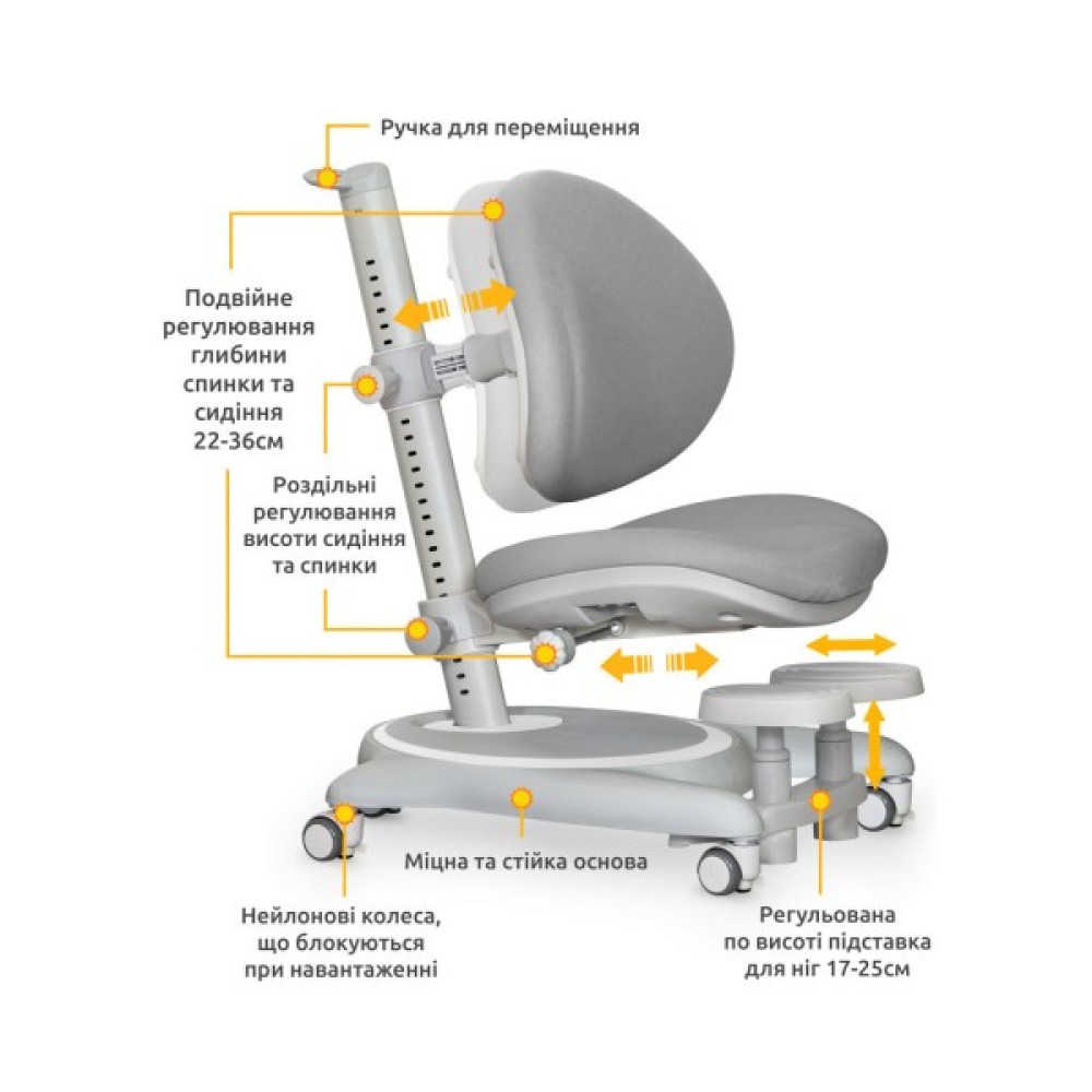 У крісла незалежне регулювання висоти спинки та сидіння. Регулювання здійснюється за допомогою спеціальних гвинтів на металевій трубі. Глибина сидіння регулюється ручкою фіксатором. Крісло підійде для дітей від 3 років до дорослого віку.