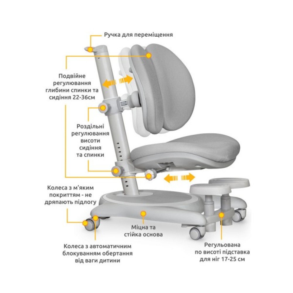 Головна особливість Mealux Ortoback Duo – збільшений діапазон регулювання глибини сидіння за рахунок рухомої спинки. Глибина спинки плавно регулюється спеціальним механізмом, глибина сидіння – ручкою- фіксатором. Крісло підійде для дітей від 3-х років до дорослого віку.