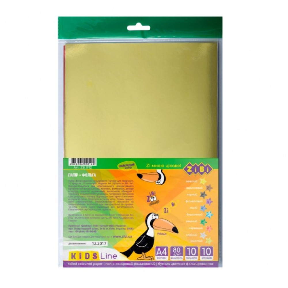 Набір кольорового фольгованого паперу — це яскравий і блискучий інструмент для втілення творчих фантазій Вашої дитини, а також для тренування почуття кольору і пропорцій, розвитку моторики. У наборі 10 аркушів фольгованого паперу в 10 кольорах (золотий, срібний, червоний, зелений, блакитний, фіолетовий, синій, коричневий, чорний, жовтий). Щільність паперу 100 г/м2.