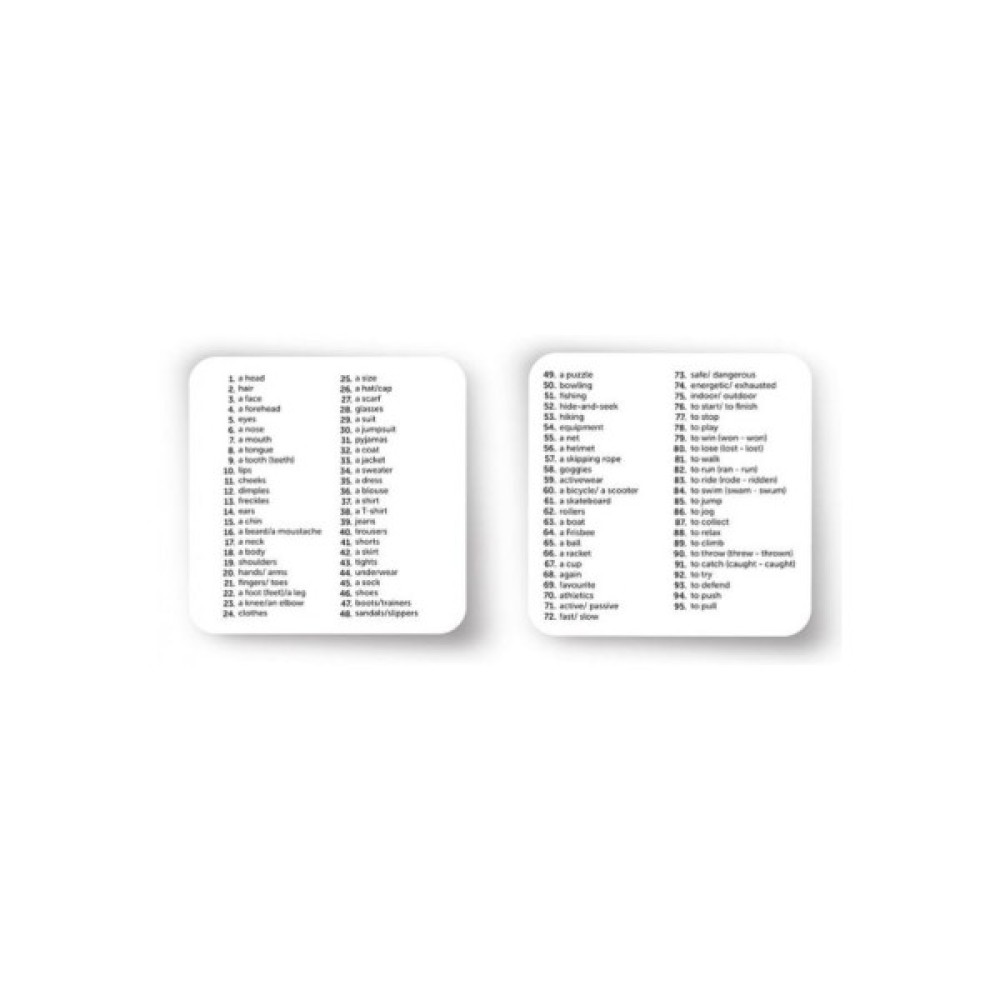 Кожна картка - це з одного боку велике зображення предмета з теми, слово англійською та транскрипція до нього, а з іншого боку - декілька словосполучень англійською та речення у трьох формах (стверджувальній, заперечній, запитальній).