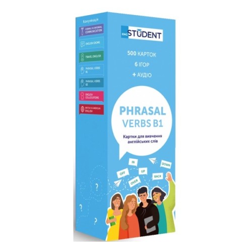 Phrasal Verbs (рівень В1) — набір карток для вивчення фразових дієслів для тих, хто тільки на середині вивчення англійської мови. Тут зібрані найпопулярніші фразові дієслова, які допоможуть твоїй англійській level up. Відтепер ти зможеш не перепитувати, що мав на увазі англієць чи американець. І знатимеш, у яких контекстах використовувати різні значення. Вибирають ті, хто хоче урізноманітнити своє мовлення та підвищити знання. У цьому наборі 500 фразових дієслів та 500 прикладів їх вживання.