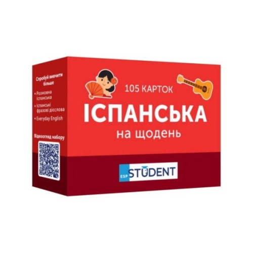 Набір «Іспанська на щодень» (рівень А1-А2) — картки із фразами на щодень для підвищення рівня володіння іспанською. Для тих, хто починає вчити іспанську, але вже хоче вміти вести елементарну розмову. 105 карток із запитаннями та популярними виразами допоможуть почуватися впевненіше під час буденної розмови та подорожі за кордон. До кожної картки набору є аудіосупровід, який додатково навчить розбиратися з правильною вимовою та сприйманням слів на слух.