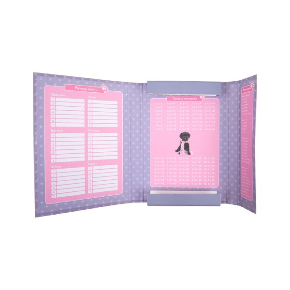 Одне містке відділення – зручне для зберігання стандартних шкільних зошитів та щоденника. Просто складіть їх в папку та забудьте про зім’яті сторінки чи скуйовджені обкладинки. Завдяки практичному формату, папка ідеально вміщається в будь-яку модель рюкзаків Kite. Щоб важливі речі завжди були перед очима, всередині є поле для розкладу, табличка множення та список величин.