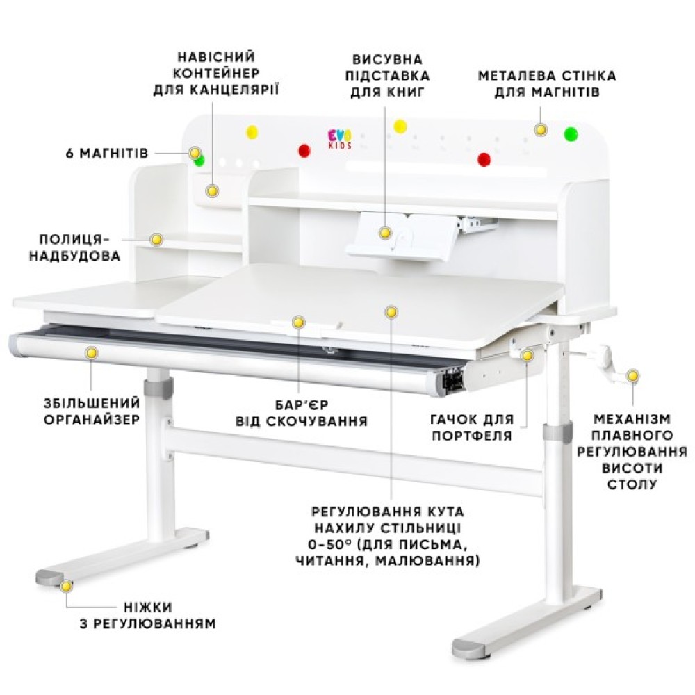 Evo-kids TH-360 Plus – це багатофункціональний дитячий стіл, спеціально розроблений для комфортного та безпечного навчання дітей. Стіл має регульовану конструкцію, що дозволяє легко підлаштувати його під потреби дитини в процесі росту, забезпечуючи правильну поставу та зручність під час роботи.