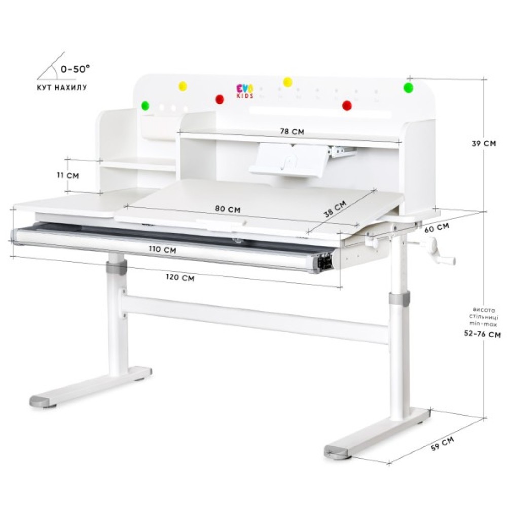 Регулювання кута нахилу стільниці (0-50°) - дозволяє оптимізувати положення стільниці для різних видів діяльності: письма, читання або малювання.