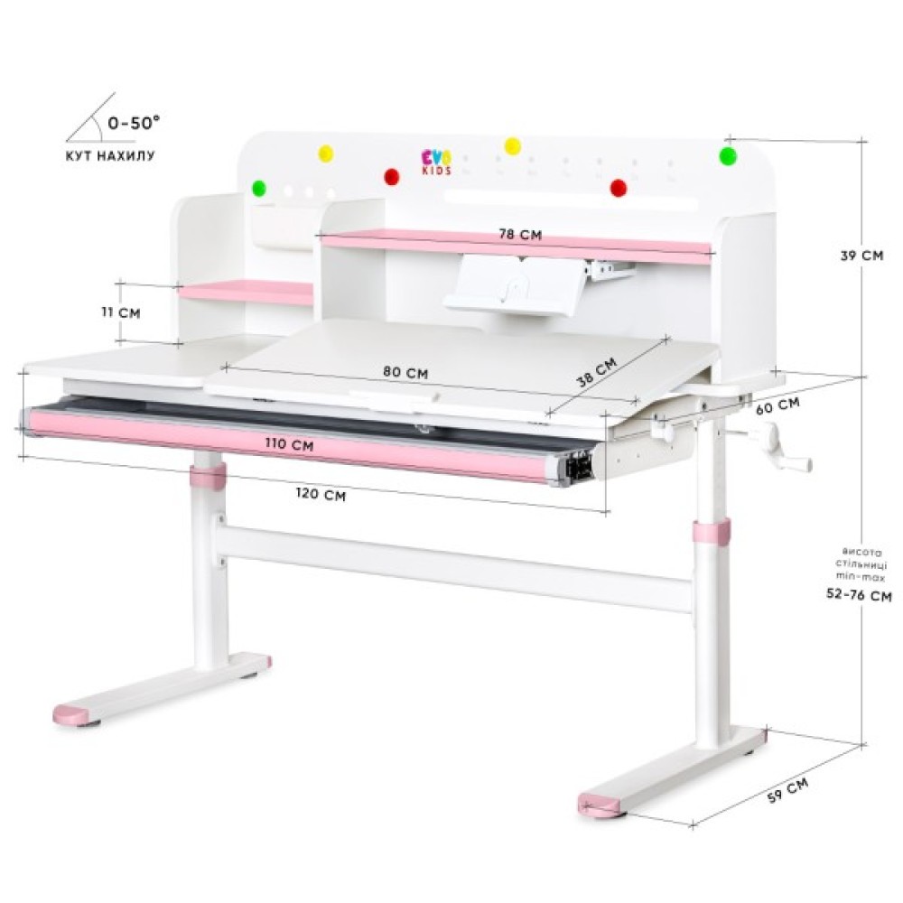 Регулювання кута нахилу стільниці (0-50°) - дозволяє оптимізувати положення стільниці для різних видів діяльності: письма, читання або малювання.