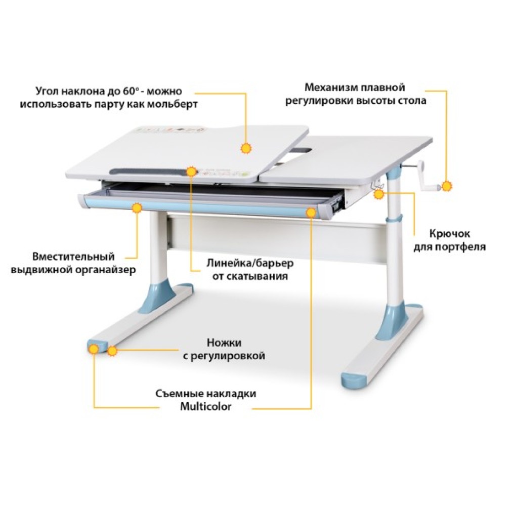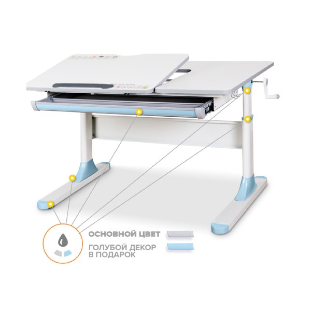 Висота столу регулюється за допомогою черв'ячного механізму ручкою, яку при складанні можна встановити праворуч або ліворуч. За допомогою газліфта рухлива частина стільниці змінює кут нахилу до 60 градусів, що допомагає зберегти правильну поставу під час роботи за столом.