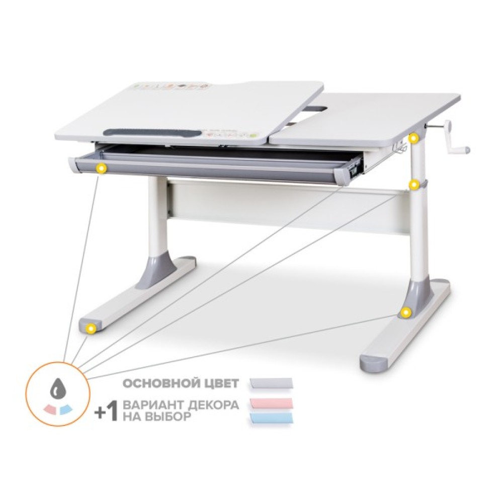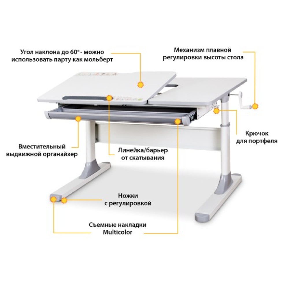 Стіл Mealux Vancouver Lite має великий висувний органайзер, розташований під стільницею, виготовлений із міцного, безпечного пластику. Парта Lite має базову комплектацію, в ній немає надмірностей, лише важливі функції для повної концентрації на навчанні та роботі. Якщо вам все ж таки потрібна невелика полиця – скористайтеся комплектацією парта + полиця BD-S50. Невелика, але зручна та стильна полиця з висувною підставкою для книги чудово доповнює парту. Висота столу регулюється за допомогою черв'ячного механізму ручкою, яку при складанні можна встановити праворуч або ліворуч. За допомогою газліфта рухлива частина стільниці змінює кут нахилу до 60 градусів, що допомагає зберегти правильну поставу під час роботи за столом. Завдяки великому діапазону зміни кута нахилу парту можна використовувати не тільки для письма та читання, а й для малювання. Спеціальний проміжок на краю частини, що рухається, зробить цей процес безпечним для дитини. Наявність знімного прогумованого бар'єру на частині стільниці, що рухається, запобігає ковзанню книг або зошитів і скачуванням дрібної канцелярії під час виконання домашнього завдання. Ще одним приємним бонусом стане металевий гачок для розміщення рюкзака чи спортивної форми. Масивні металеві ніжки доповнені спеціальними меблевими регулювальними опорами для забезпечення його стійкості.
