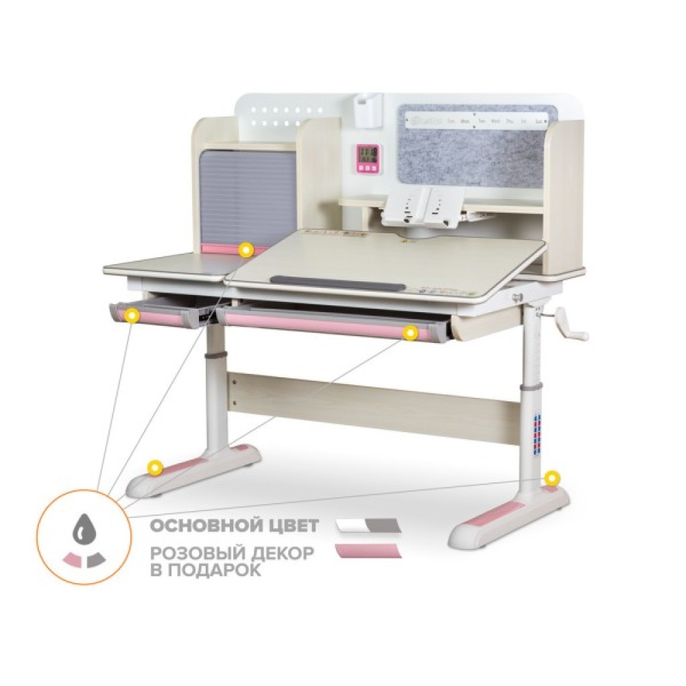 Накладки Multicolor. Важливою особливістю даного столу є наявність змінних кольорових накладок. Купуйте стіл сірого кольору і отримаєте на вибір або блакитні, або рожеві накладки. Накладки змінюються на ніжках, висувному органайзере, пеналі і на ніші з рухомим ролетом. Міняйте колір декору в залежності від настрою вашої дитини!