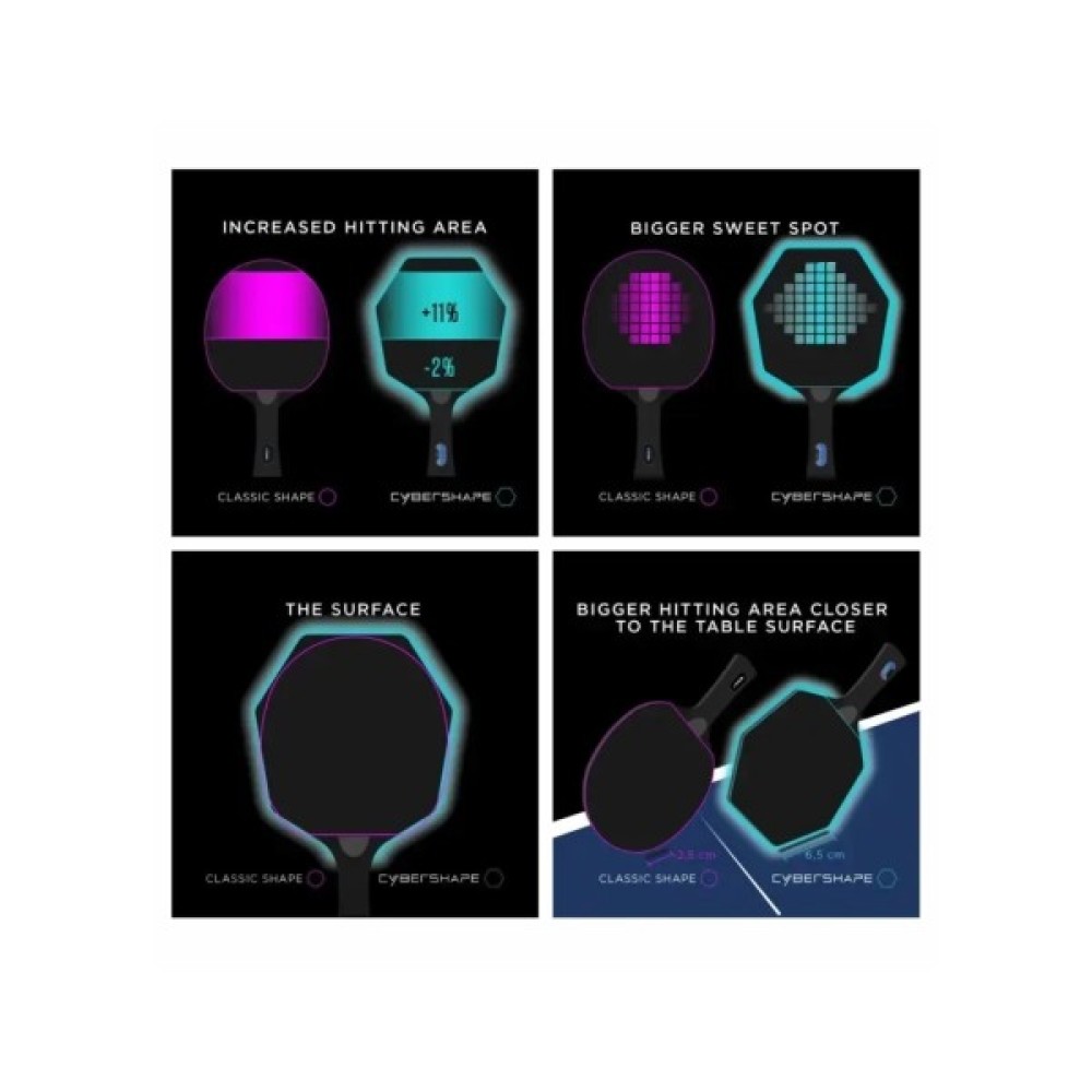 - Більша зона удару ближче до поверхні столу — однією з відмінних особливостей конструкції Cybershape є те, що зона удару у поверхні столу збільшена до 6,5 см, у порівнянні з 2,5 см для круглого леза. Це дає вам більше шансів виконати короткі подачі та повернення