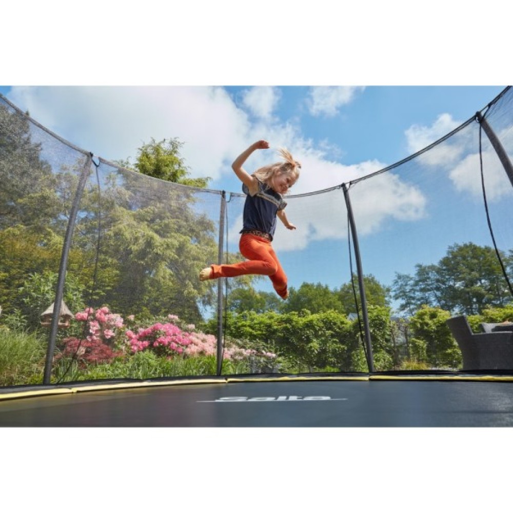 Чорна сталева рама оцинкована, що забезпечує міцність конструкції. Не потрібно турбуватися про безпеку під час стрибків на Comfort Edition Ground, оскільки щільна захисна сітка забезпечує оптимальний захист. Двостороння блискавка дає змогу дітям легко закривати та відкривати сітку з обох боків.