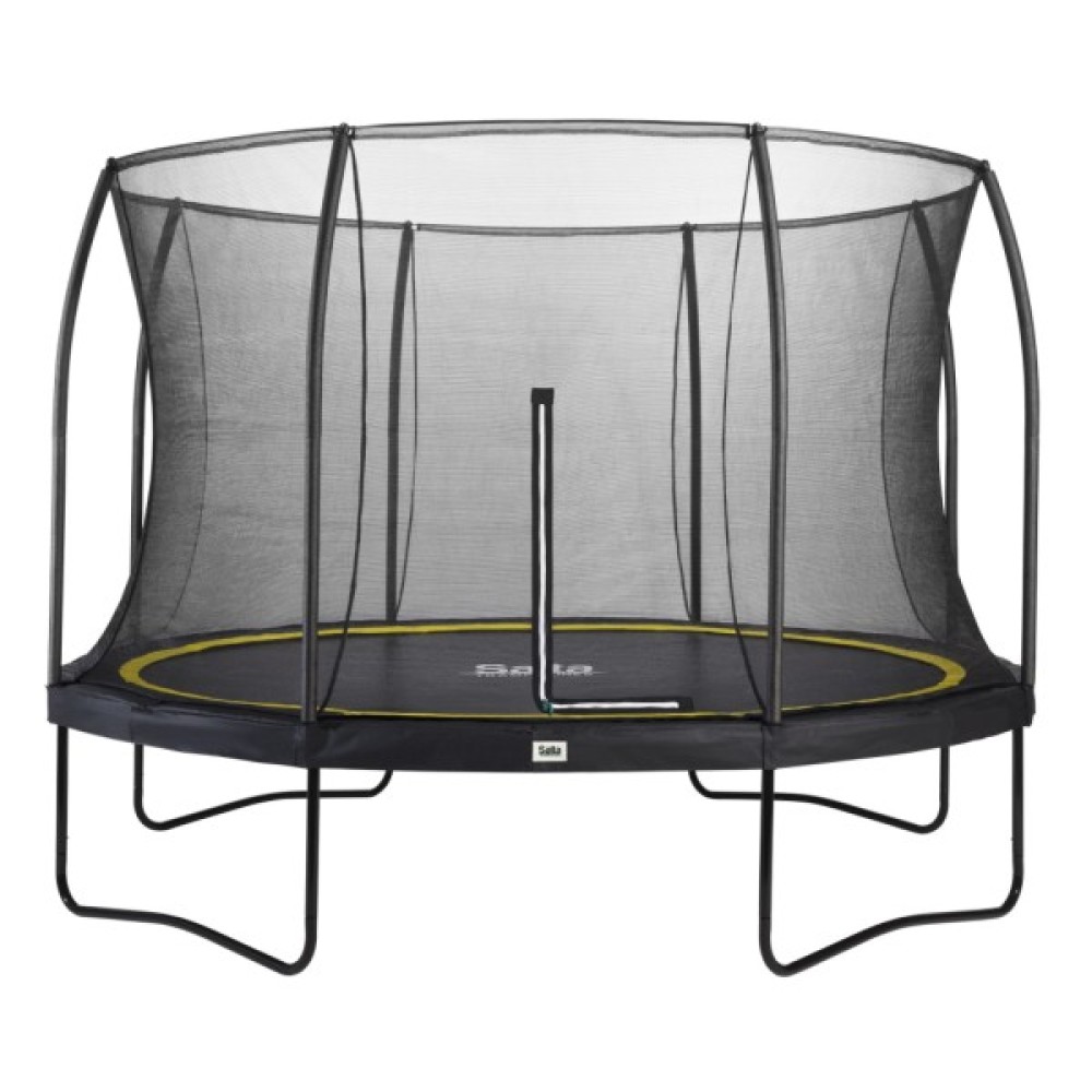 Рами з оцинкованої сталі, оздоблені чорним глянцевим покриттям, утворюють надійну основу батута. Захисна сітка розроблена таким чином, щоб забезпечити оптимальний захист і безпеку під час стрибків. Конструкція сталевої стійки утримує захисну сітку в елегантному положенні та залишається привабливо натягнутою. Крім того, вхід у батут оснащений захисною сіткою з подвійною блискавкою, що робить вхід і закриття батута дуже простим.