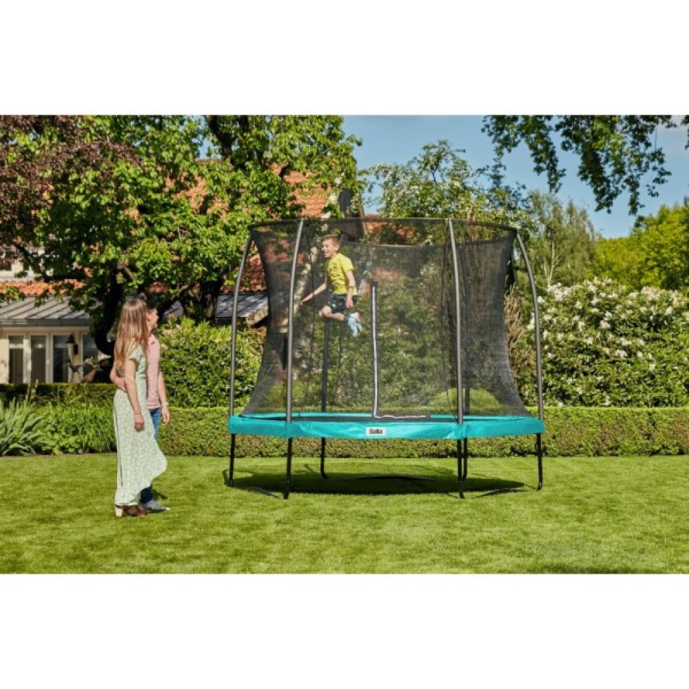 Рами з оцинкованої сталі, оздоблені чорним глянцевим покриттям, утворюють надійну основу батута. Захисна сітка розроблена таким чином, щоб забезпечити оптимальний захист і безпеку під час стрибків. Конструкція сталевої стійки утримує захисну сітку в елегантному положенні та залишається привабливо натягнутою. Крім того, вхід у батут оснащений захисною сіткою з подвійною блискавкою, що робить вхід і закриття батута дуже простим.