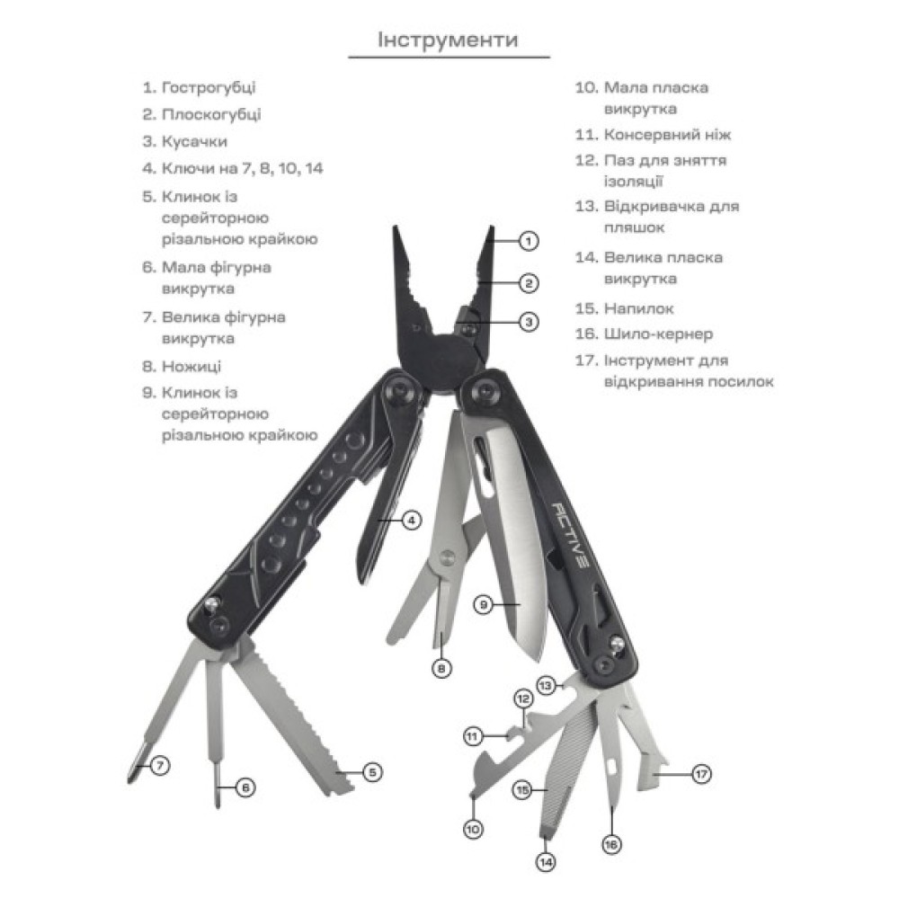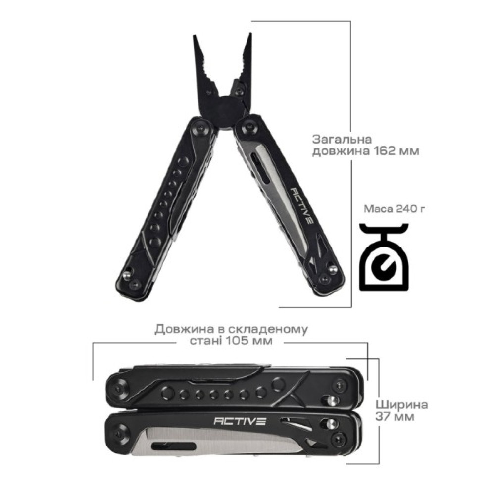 Мультитули бренду Active Knives&Tools - це сучасні, універсальні інструменти, головною відмінністю яких, є співвідношення ціни-якості в порівнянні з мультитулами інших брендів. Мультитули ідеально справляються з поставленими завданнями завдяки інструментам з високоякісної нержавіючої сталі. Ергономічні руків’я відмінно лежать в руці та забезпечують надійний хват. Це незамінні супутники як у повсякденному житті, так і під час відпочинку чи туризму.