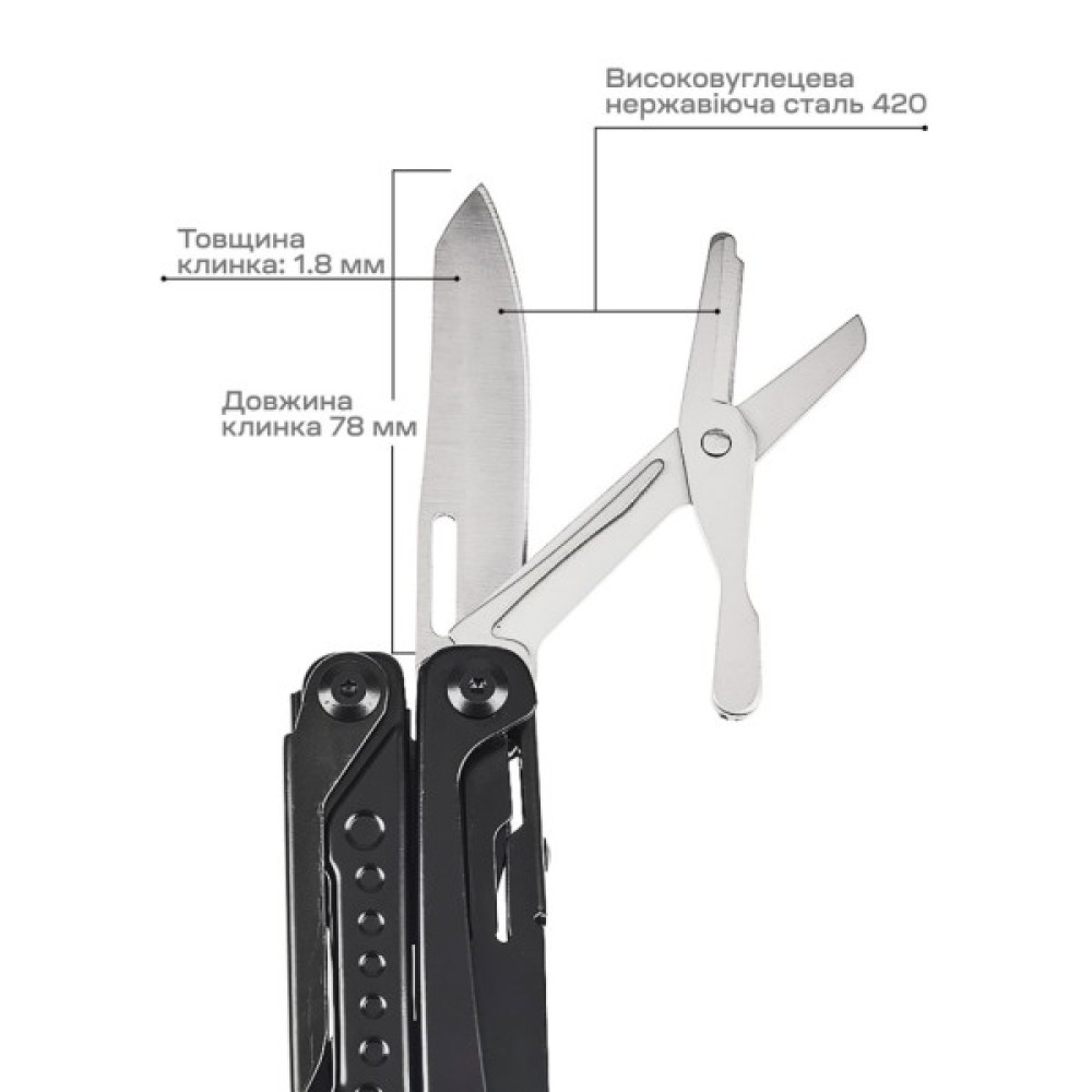 Active Boa – це багатофункціональний інструмент, який має широкий спектр застосування та стане незамінним помічником, як у місті, так і в польових умовах. Мультитул має ергономічний дизайн, завдяки якому він зручно лягає в руку. Серед додаткових інструментів варто відзначити клинок із нержавіючої сталі довжиною 78 мм. Руків’я та плоскогубці мають чорне антиблікове покриття. Мультитул Active Boa комплектується нейлоновим чохлом.