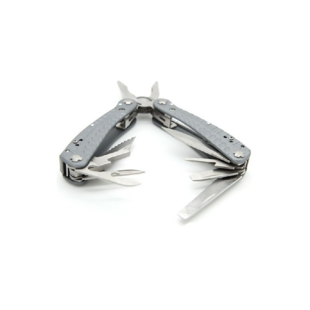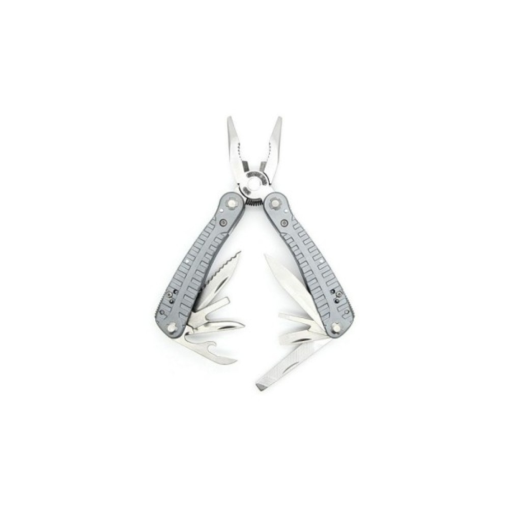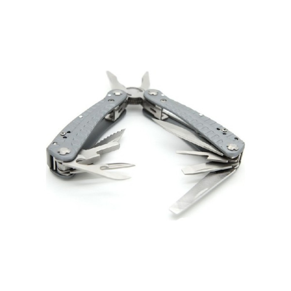 Інструменти в комплекті Гострогубці; Плоскогубці; Шило; Напилок; Консервний ніж; Відкривачка для пляшок; Лінійка; Викрутка плоска середня; Викрутка плоска мала; ніж з серрейтором; тримач для біт; 10 змінних біт