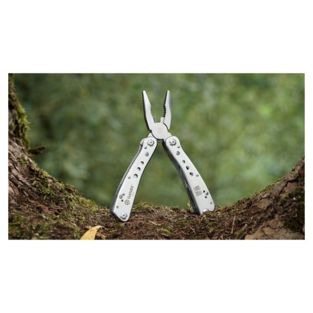 Мультитул Ganzo G201 стане прекрасним придбанням для туриста і просто активної людини. По суті, він представляє з себе справжню похідну майстерню. У невеликому корпусі інструменту полягає відразу 22 різних елементів, які допоможуть впоратися з найрізноманітнішими поломками і несправностями. В першу чергу, це плоскогубці з кусачками. Вони зроблені повнорозмірними, а тому впораються навіть зі значними навантаженнями. Решта ж інструменти зменшені, щоб їх можна було розмістити всередині рукояток мультитула. У перелік входять пила, звичайний ніж і лезо з хвилястим заточуванням, ножиці, дві викрутки з плоским шліцом різного розміру, відкривачка. Ще один інструмент-тримач для знімних викруток. Ці елементи зібрані в загальному органайзері, де знаходиться і магнітний перехідник. З їх допомогою ви легко впораєтеся з будь-якими болтами і шурупами.