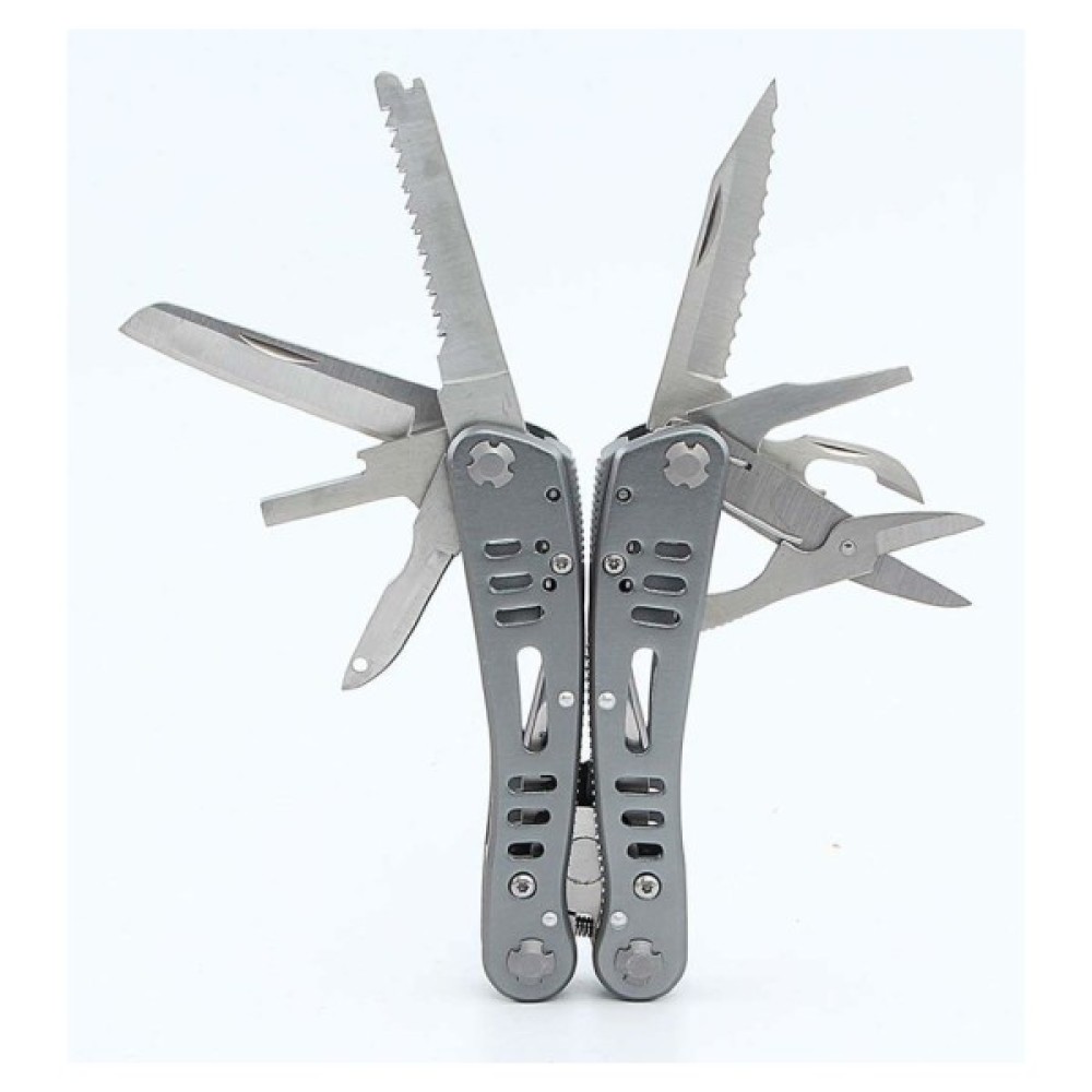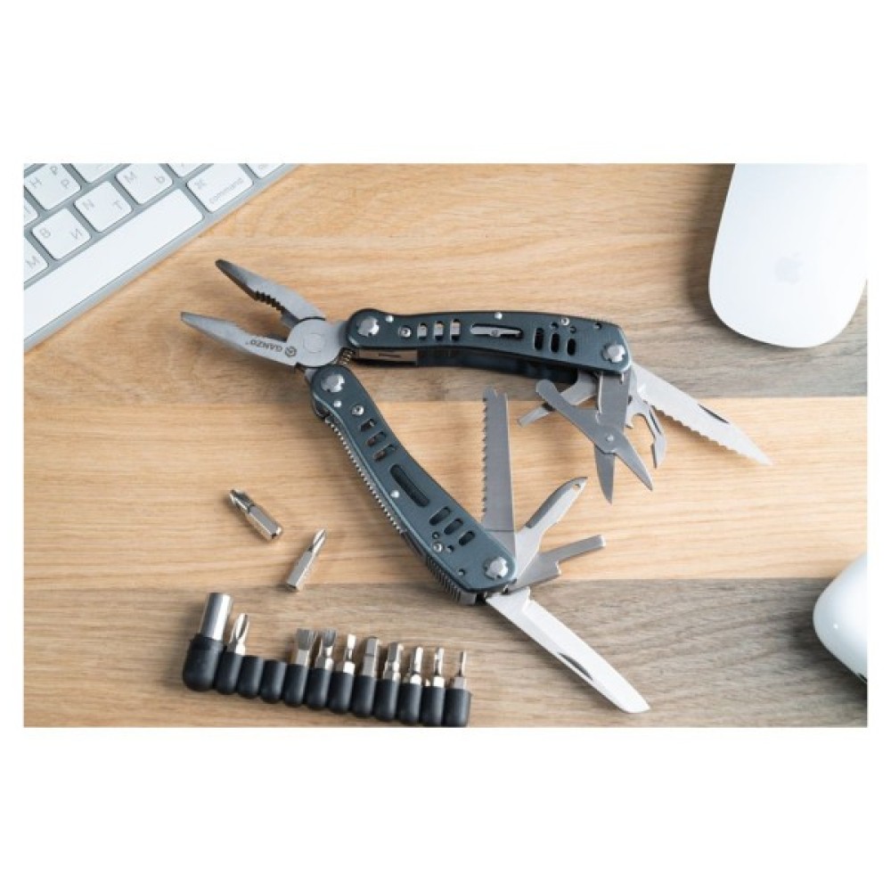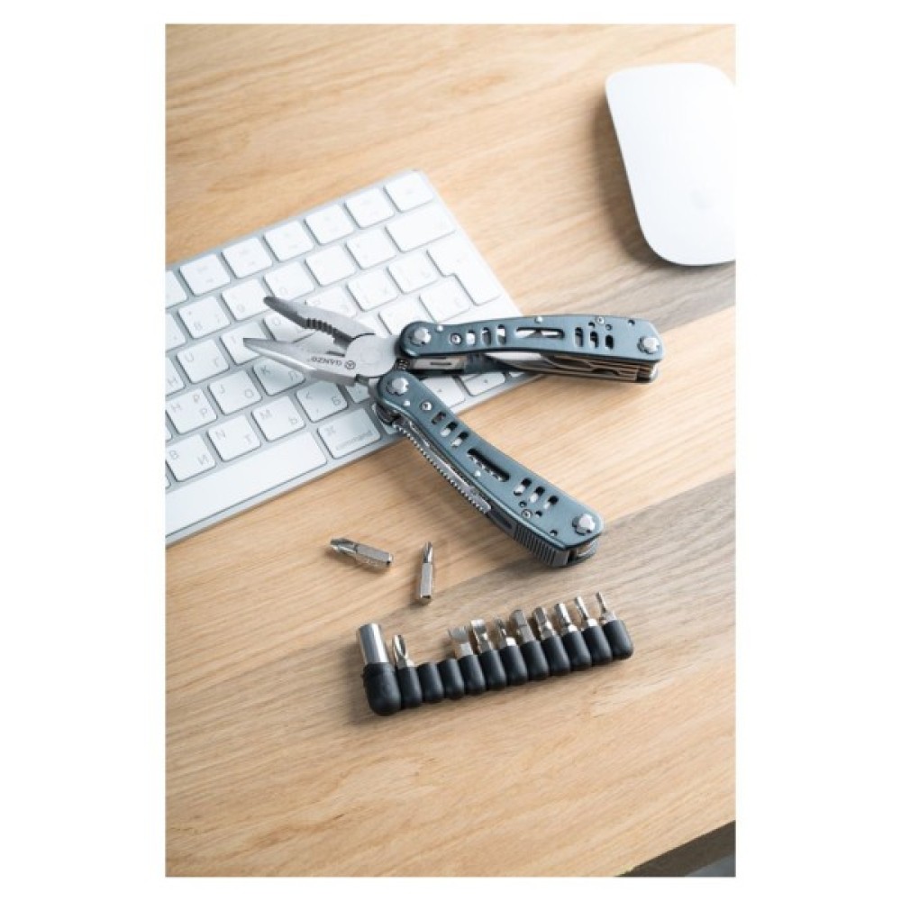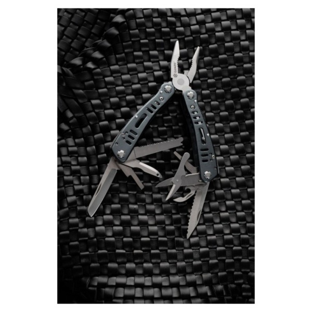 У розпорядженні власника мультитула-два ножі з заточуванням леза різного типу, ножиці, пила, шило, відкривачка, викрутка з невеликим плоским шліцом. Крім того, в гумовому органайзері зібраний великий комплект змінних біт, які фіксуються за допомогою магнітного утримувача. Це насадки з прямим, хрестоподібним і шестигранним перетином. Як і інші інструменти мультитула, вони зроблені з відшліфованої сталі без покриття.