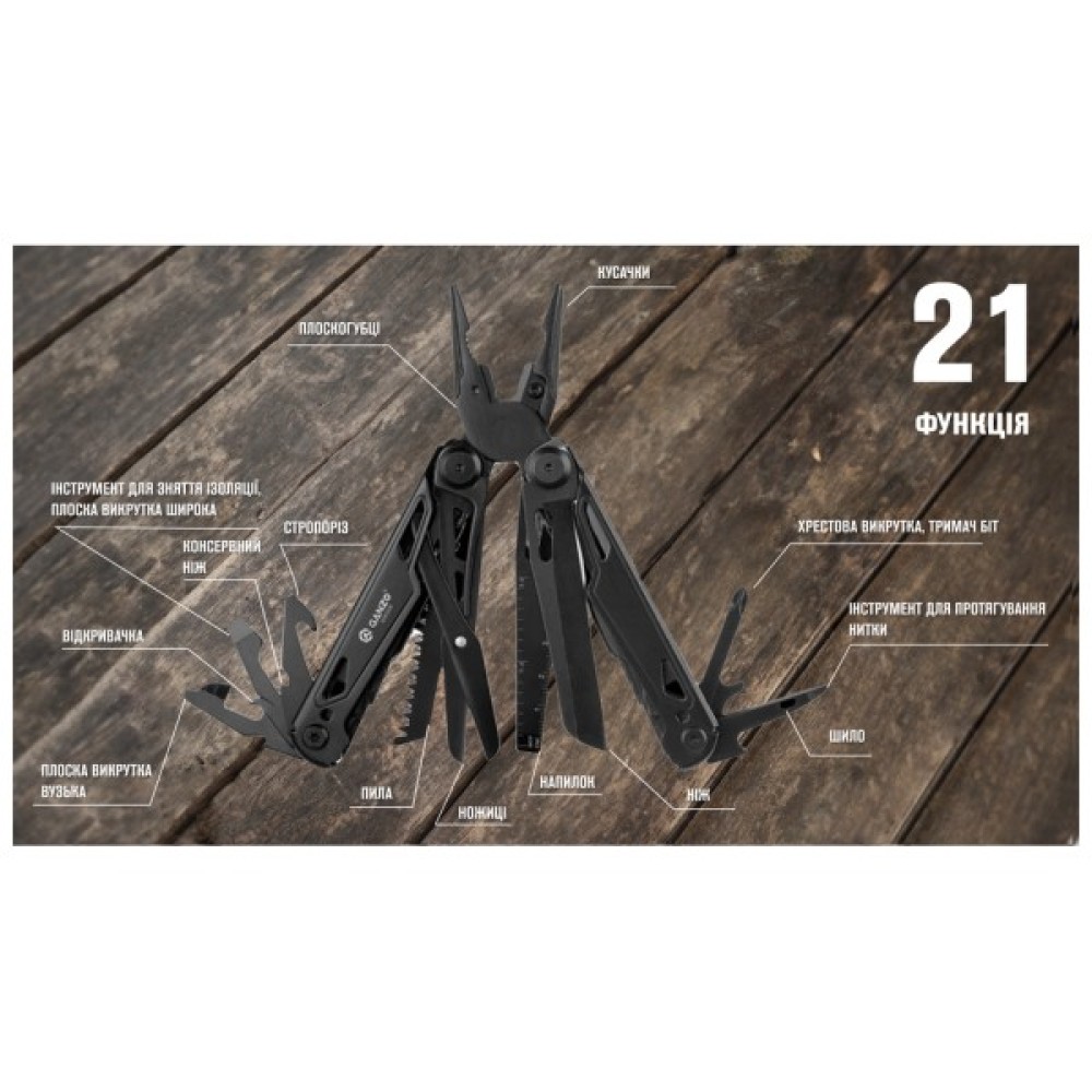 Інструменти в комплекті Пила; Ножиці; Шило; Напилок; Консервний ніж; Стропоріз; Відкривачка для пляшок; Лінійка; Інструмент для зачищення проводів; Викрутка плоска; Викрутка хрестова; біти; серейторна пилка