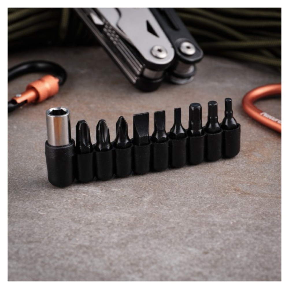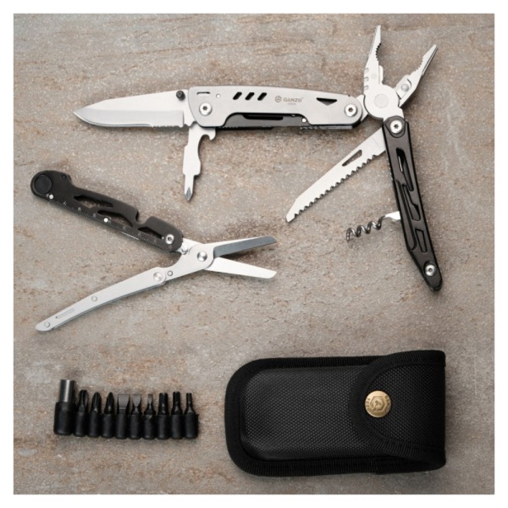 Функціонал Ganzo G304 розширюють 9 змінних біт, які входять до набору разом з тримачем. Щоб перетворити мультитул на викрутку, необхідно зафіксувати тримач на елементі з хрестоподібним наконечником, а потім — помістити в тримач необхідну біту.