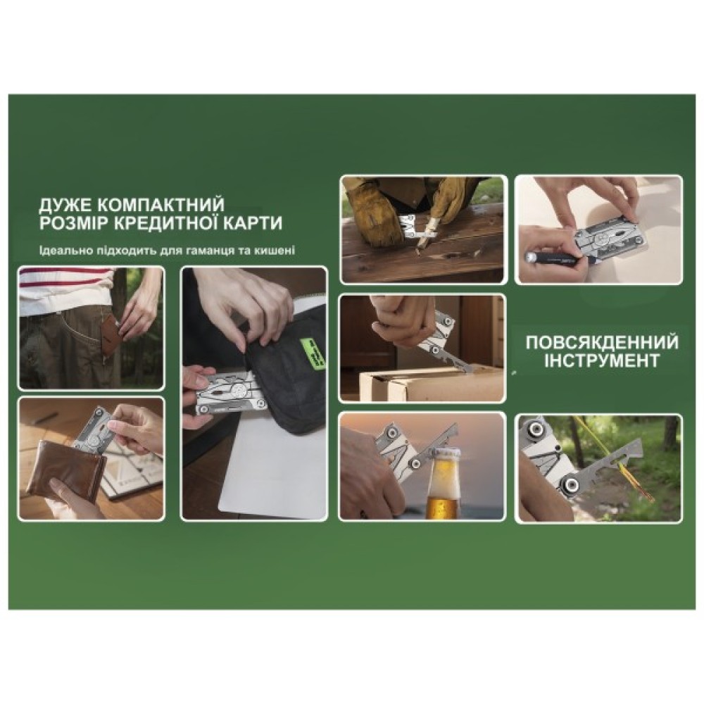 Конструкція розміром з банківську картку вміщує повноцінний набір інструментів з різними функціями — від різання та роботи з кріпленнями до експрес-ремонту під час подорожей.