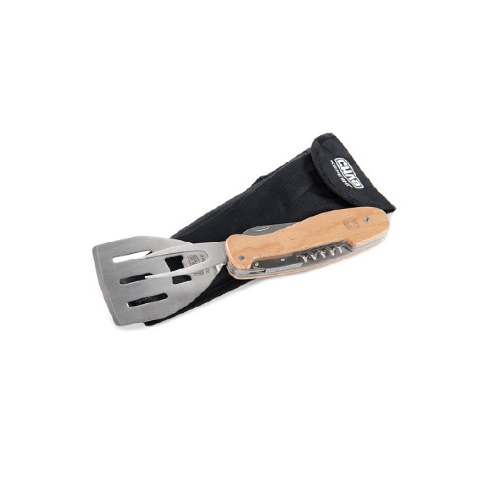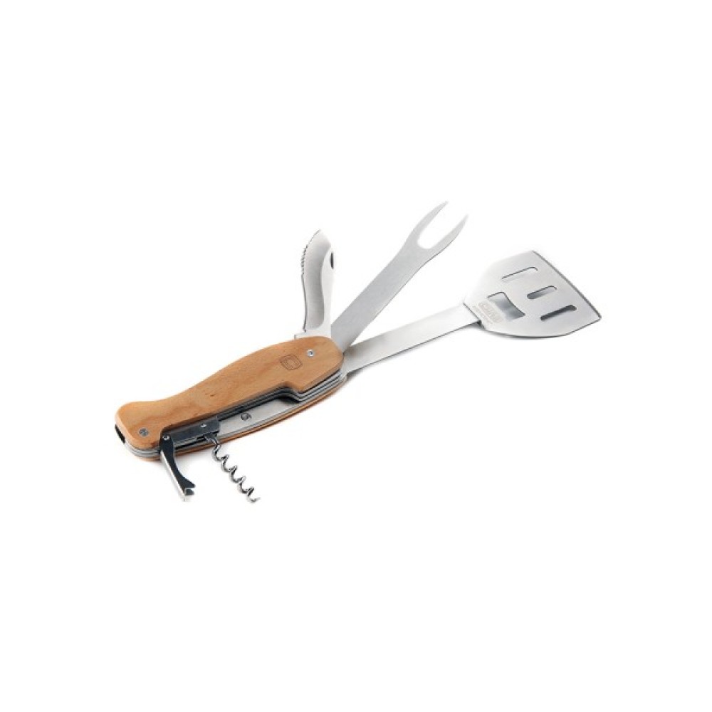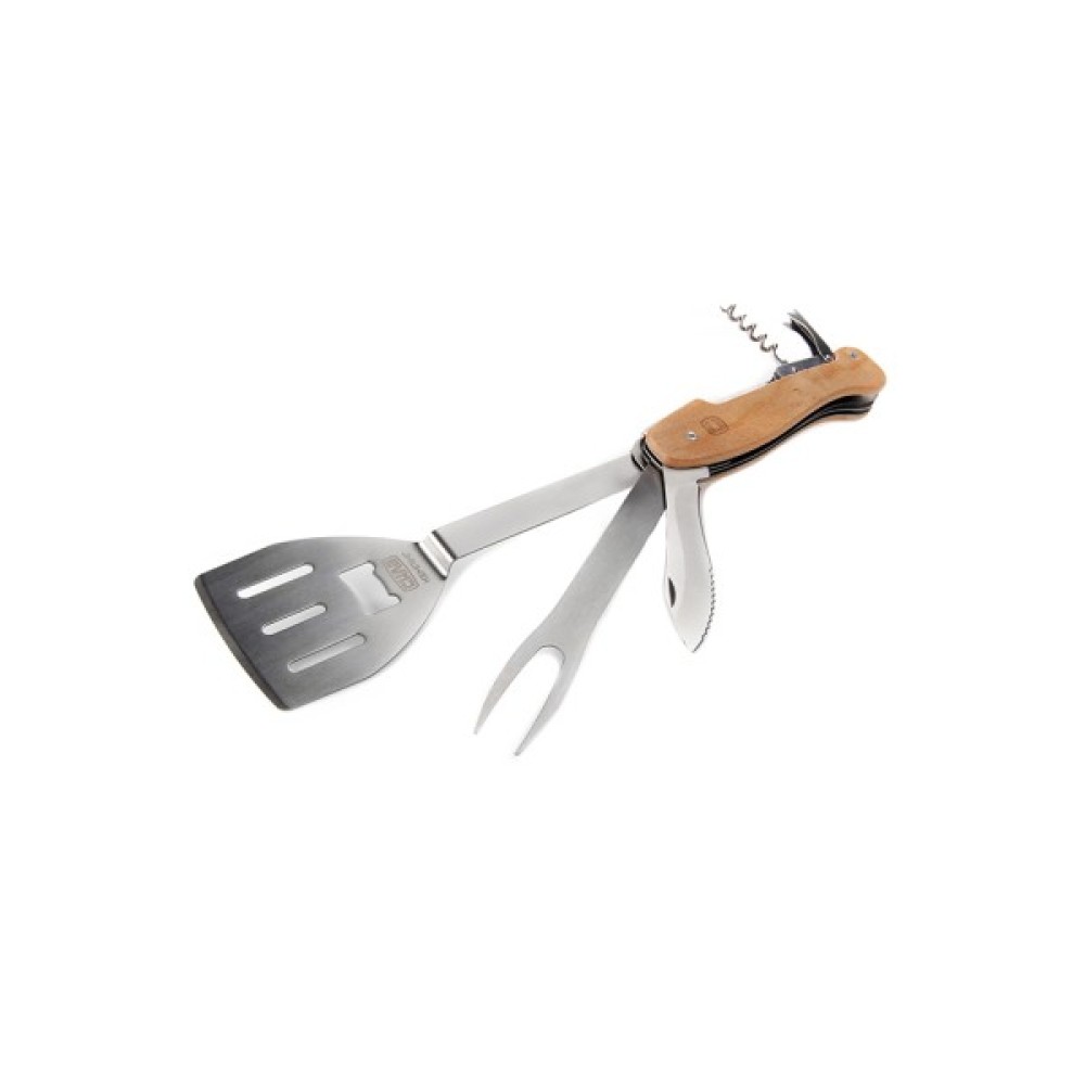 У комплекті ви знайдете лопатку для гриля, виделку для барбекю, ніж, штопор та відкривач для пляшок. Всі ці інструменти об'єднані в одне компактне дерев'яне руків'я, яке, окрім функціональної зручності, додає естетичної привабливості вашому обладнанню. Загальна довжина становить 277 мм, що дозволяє зручно зберігати мультитул навіть у кишені або рюкзаку, а його вага всього 325 г робить його надзвичайно легким.
