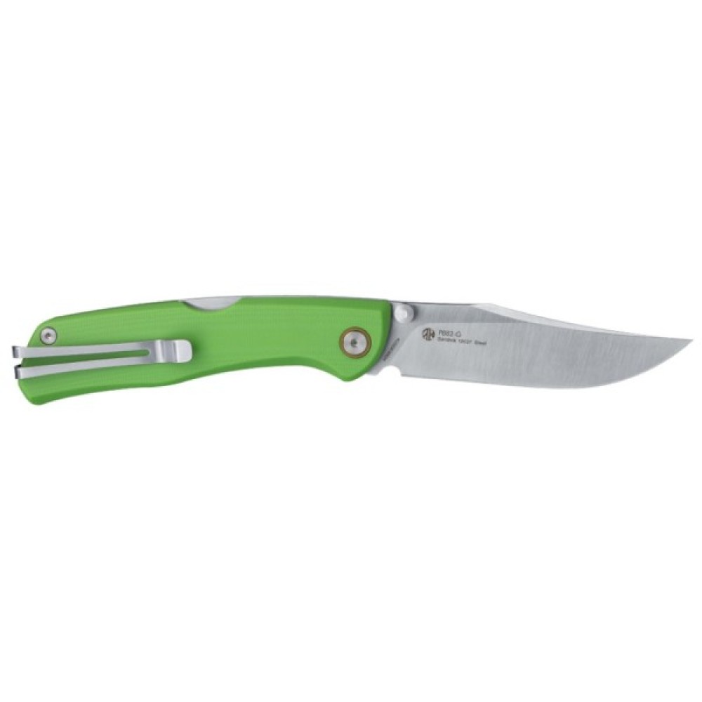 Клинок з нержавіючої сталі Sandvik 12C27, загартованої до 57-59 HRC, легко заточується та надовго зберігає гостроту кромки, а сатиновий фініш усуває відблиск металу та приховує відбитки пальців. Профіль клинка з прямим заточуванням і подовженим вістрям однаково гарний як для різання, так і для проколювання.