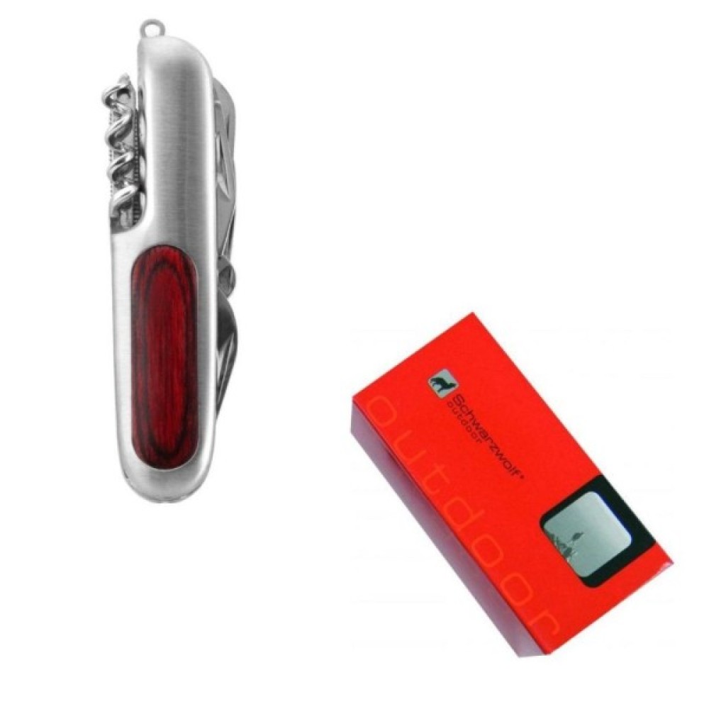 Багатофункційний складаний ніж 9 в 1 Hunter від Schwarzwolf з дерев'яною накладкою містить: великий ніж, пилку, ножиці, консервний ніж, відкривачку для пляшок і маленьку плоску викрутку, викрутку Філіпс, очищувач для нігтів, голку для шкіри. Упакований в подарункову коробку Schwarzwolf.