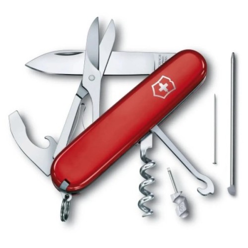 Victorinox Compact - дуже збалансована модель в лінійці офіцерських ножів 91 мм. Незважаючи на компактні розміри, ніж містить 15 інструментів! Унікальність ножа Вікторинокс Компакт полягає у великій кількості інструментів, прихованих у рукояті ножа. У рукояті цієї моделі Ви знайдете не тільки традиційні зубочистку та пінцет, але ще кулькову ручку та шпильку. У штопор ножа вкручена міні-викрутка, а на торці багатофункціонального гачка - пилка для нігтів.
