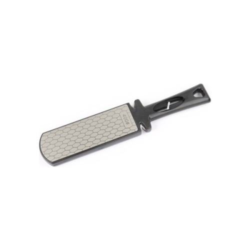 • З одного боку знаходиться пластина зернистістю 400 грит, призначена для грубої заточування леза з формуванням необхідного кута;