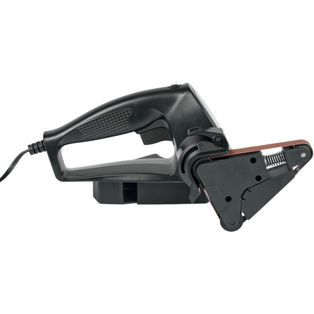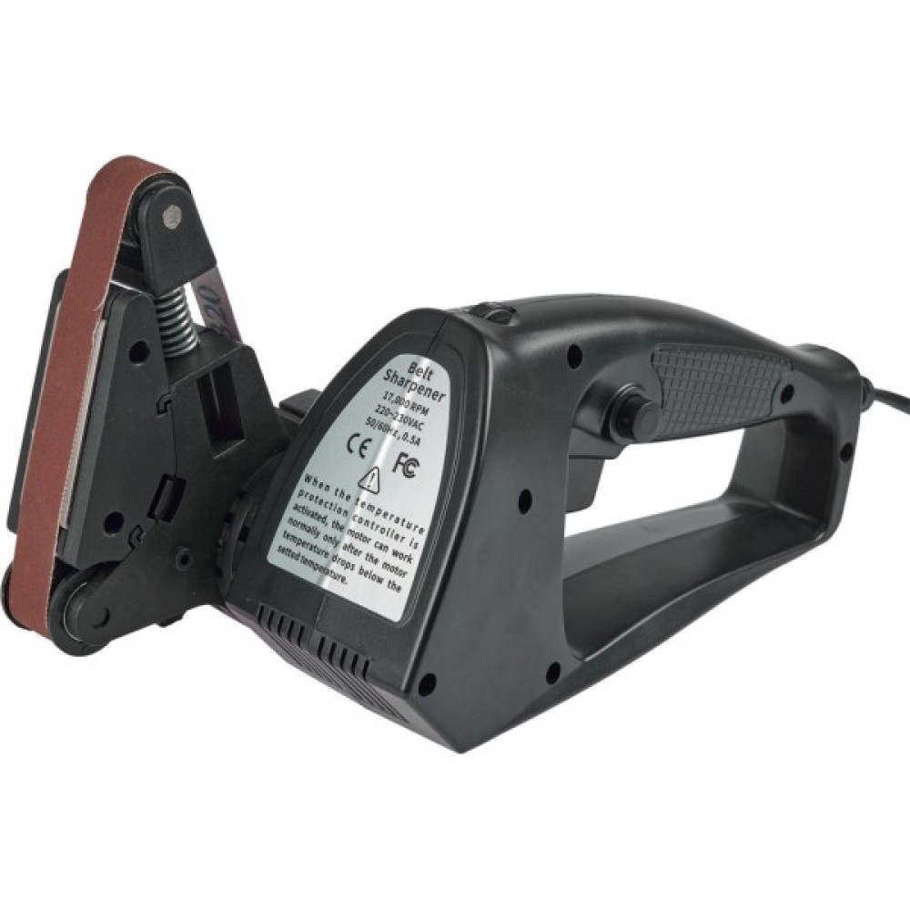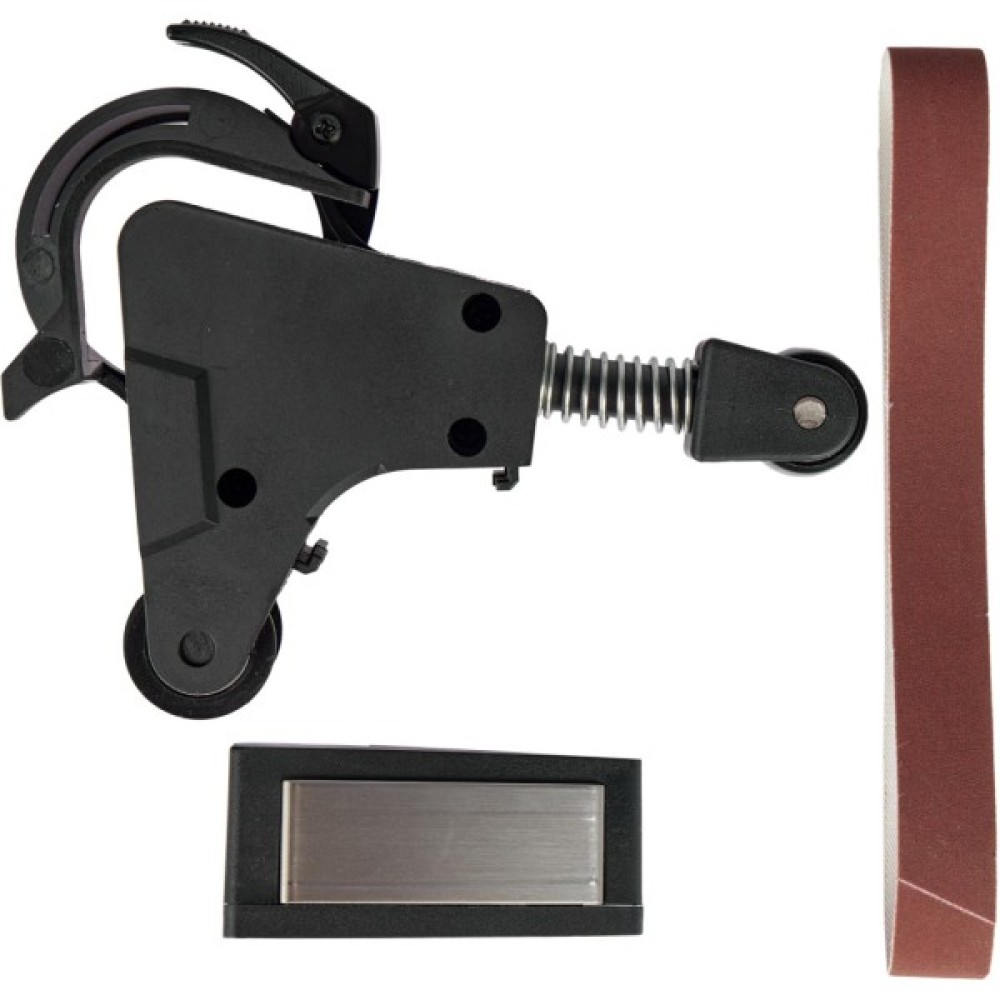 В комплекте идет вспомогательная плоская поверхность, которая поможет шлифовать места на инструментах с прямой поверхностью для заточки. В случае ее снятия, гибкий абразивный ремень поможет полировать изогнутые поверхности. В комплекте поставляется абразивный ремень 320 зернистости. Питается электроточило Risam RE009 от сети 100-240 В.