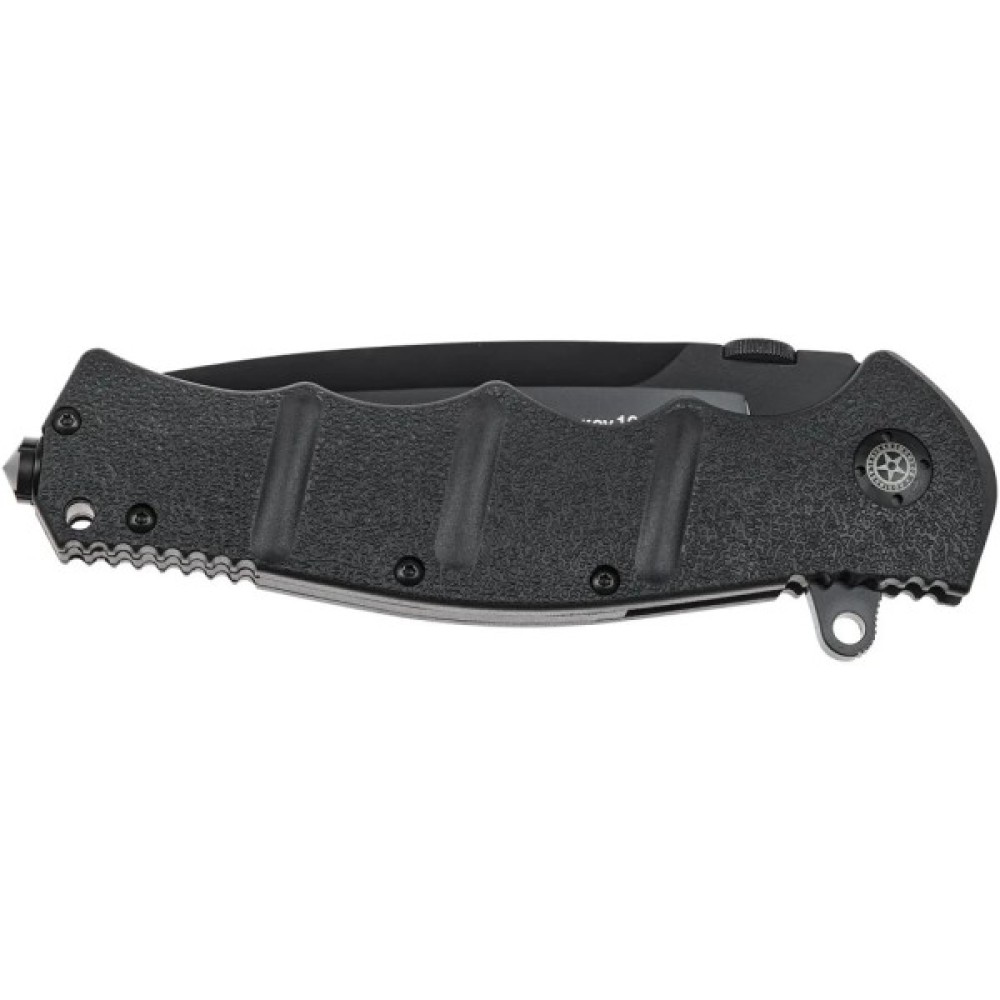 АК101 – потужний ніж з клинком 10 см, добре підійде для полювання, походів і будь-яких екстремальних ситуацій. Рукоять ножа завдяки своїй формі, текстурі і наявності упору для великого пальця з насічкою забезпечує впевнене і комфортне утримання ножа в будь-яких умовах. Під накладками конструкція рукояті посилена за рахунок сталевих пластин товщиною 1,5 мм. Виступ на початку клинка, фліпер, дозволяє швидко відкрити ніж, а після відкриття - грає роль гарди для захисту пальців. Крім фліпера клинок можна акуратно відкрити пальцем (навіть в рукавичці) за допомогою спеціального упору – диска на обуху клинка. Клинок, зроблений зі сталі 440С або D2, його вигнута форма з невеликим «черевом» дозволяє комфортно різати різні матеріали. Для екстрених ситуацій в рукояті ножа встановлений склобій. Замок ножа – «лайнер-лок», кліпса дозволяє носити ніж в кишені у положенні вістрям клинка вверх.