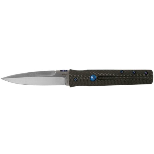 Ви можете швидко і легко відкрити його диском для великого пальця. У відкритому стані лезо фіксується міцним замком вкладишем. Звертає на себе увагу невелика вага. Він важить всього 60 грам! Це результат використання матеріалу ручки : вуглецевого волокна. Легкий, міцний і красивий. Синьо-блакитні акценти відмінно виглядають на цьому чорному матеріалі. Лезо виготовлене з VG10. Японська нержавіюча сталь, яку легко заточувати